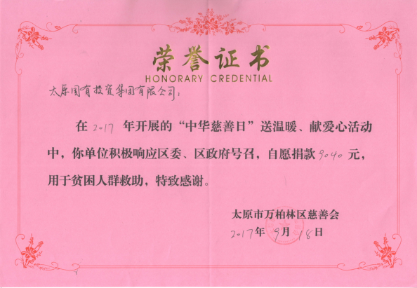 樂善好施、扶貧幫困是中華民族的傳統(tǒng)美德;奉獻(xiàn)社會、傳遞愛心是社會倡導(dǎo)的時代新風(fēng)。為培育和弘揚社會主義核心價值觀,廣泛動員員工參與慈善、奉獻(xiàn)愛心,形成團(tuán)結(jié)互助、扶貧濟(jì)困的良好風(fēng)尚,積極參與公民道德宣傳日活動。9月14日,太原國投集團(tuán)組織開展了“中華慈善日”送溫暖、獻(xiàn)愛心捐款活動,共募集善款9040元整。