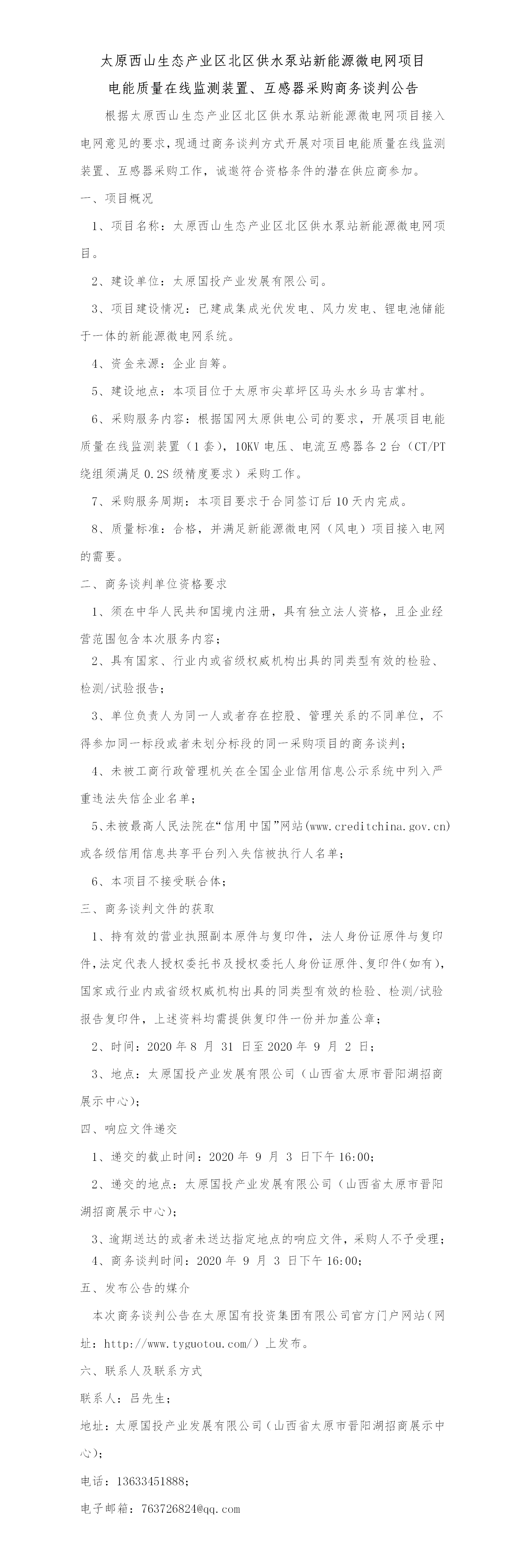太原西山生態(tài)產(chǎn)業(yè)區(qū)北區(qū)供水泵站新能源微電網(wǎng)項(xiàng)目電能質(zhì)量在線監(jiān)測(cè)裝置、互感器采購商務(wù)談判公告
