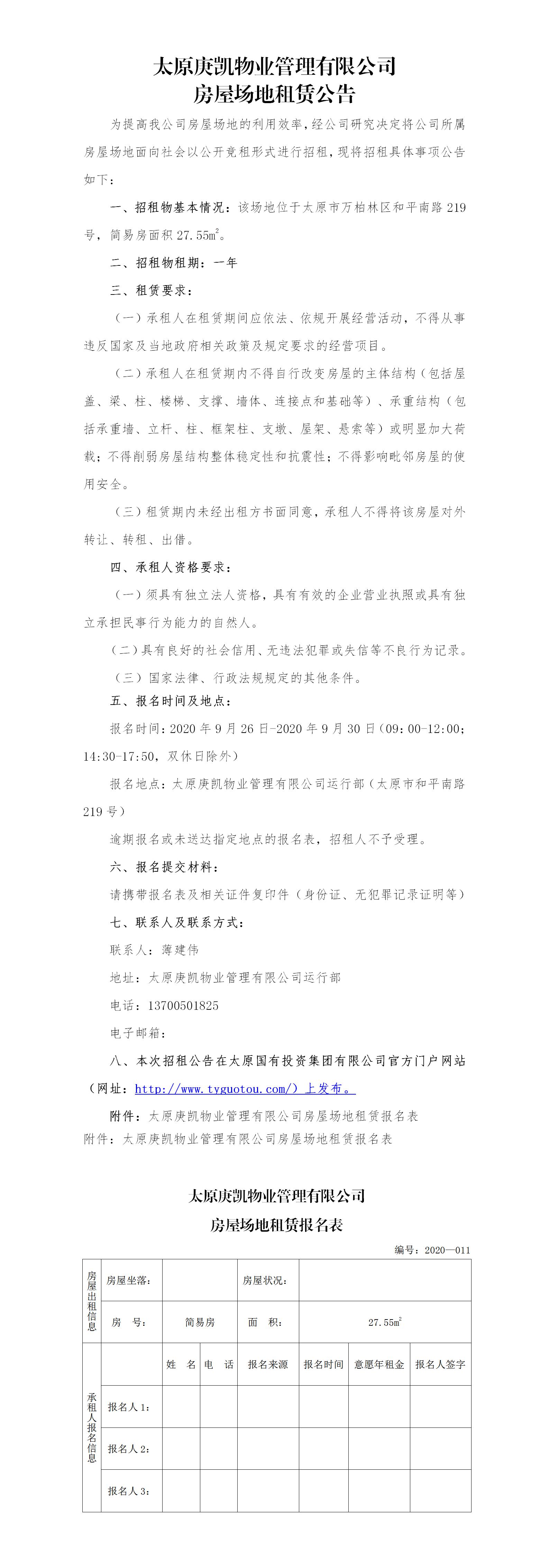 太原庚凱物業(yè)管理有限公司房屋場(chǎng)地租賃公告(十一)