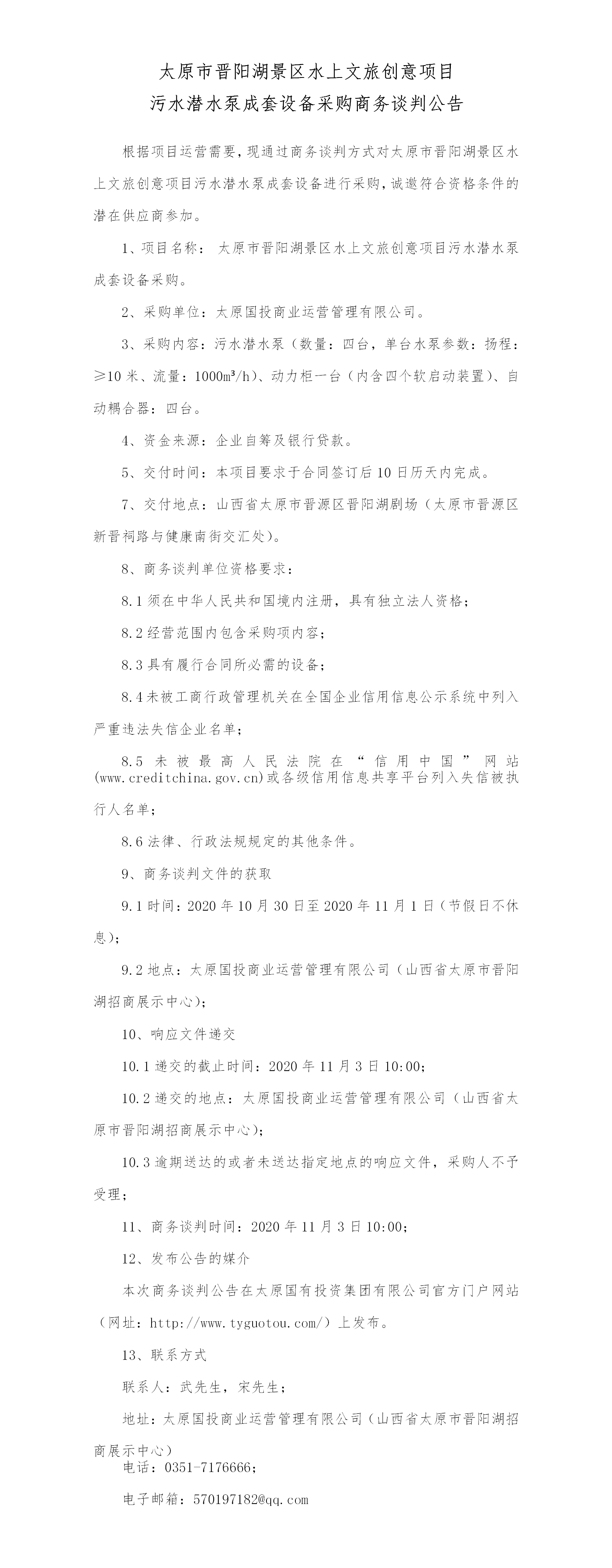 太原市晉陽湖景區(qū)水上文旅創(chuàng)意項(xiàng)目污水潛水泵成套設(shè)備采購商務(wù)談判公告