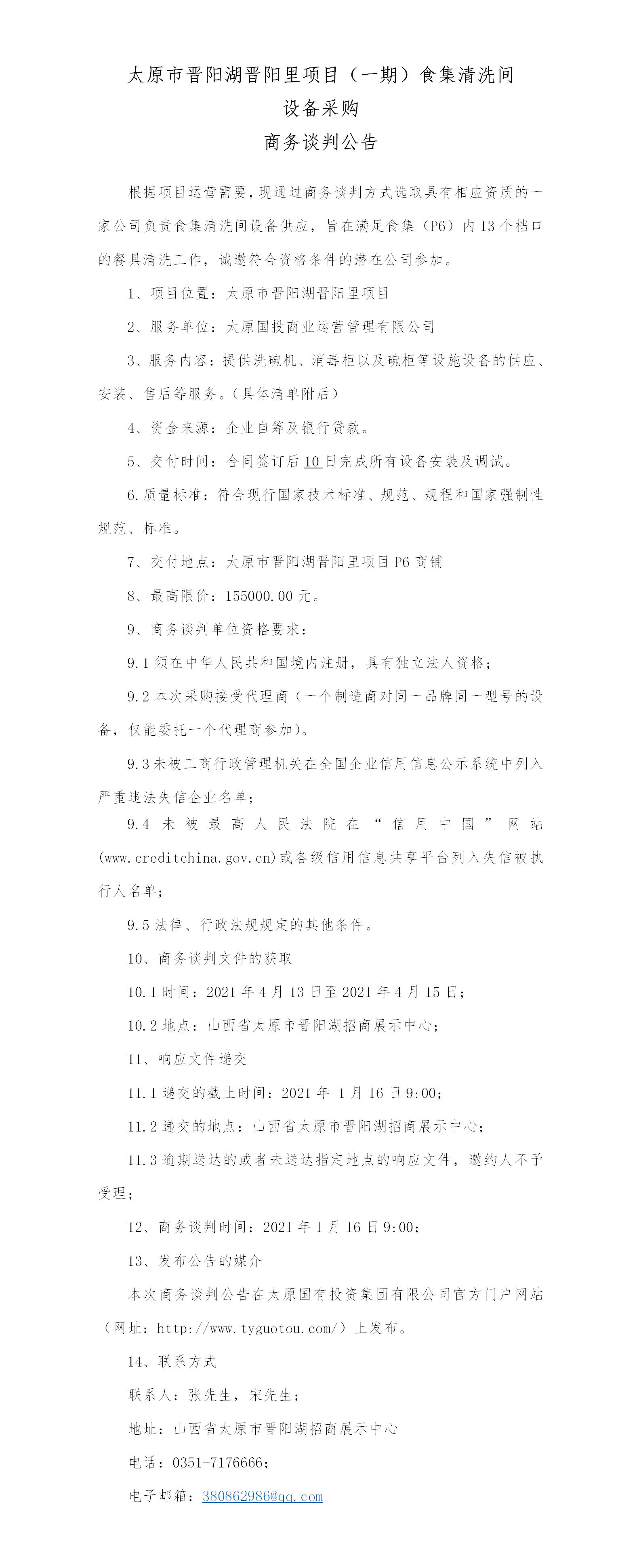 太原市晉陽湖晉陽里項目(一期)食集清洗間商務談判公告