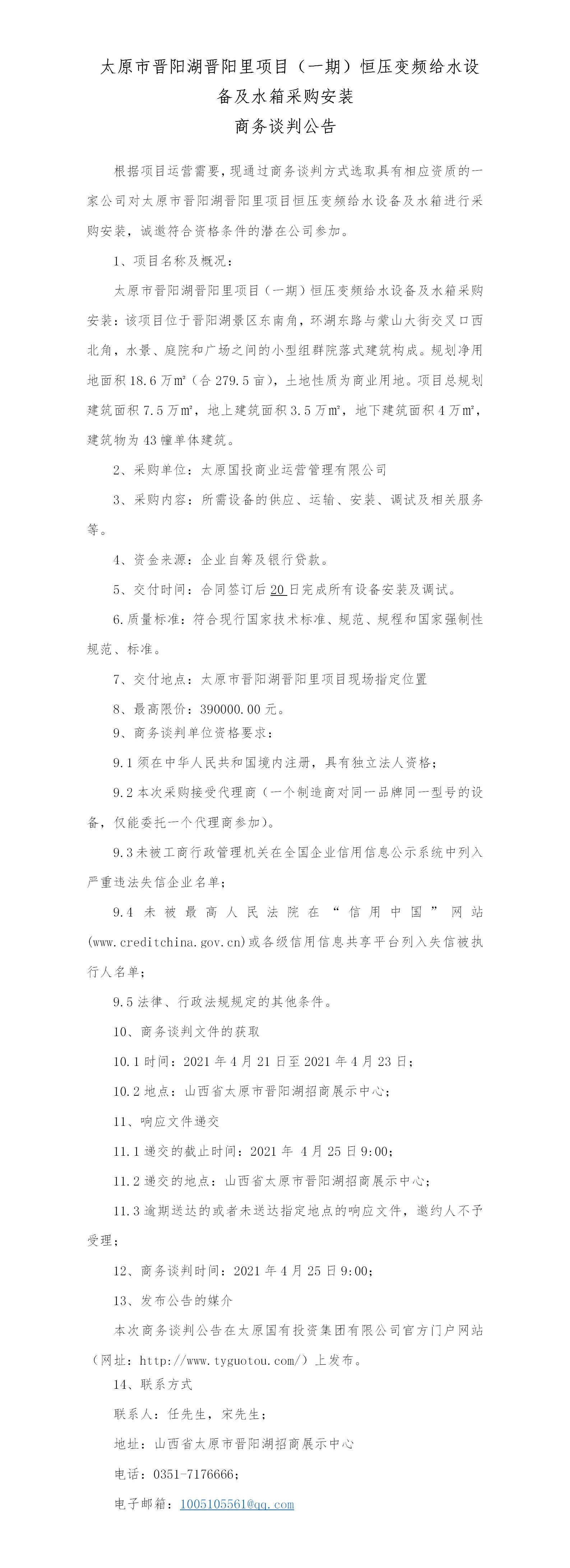 太原市晉陽湖晉陽里項目(一期)恒壓變頻給水設備及水箱采購安裝商務談判公告