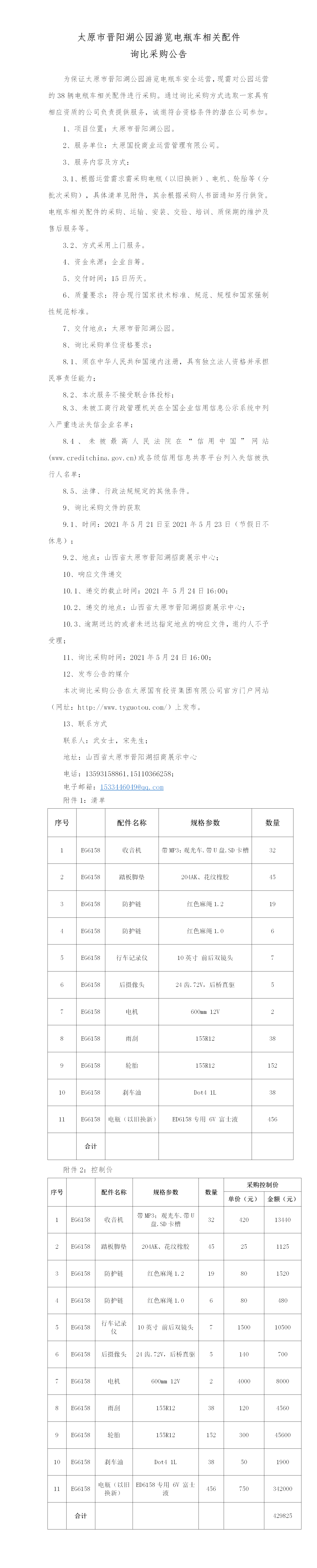 太原市晉陽湖公園游覽電瓶車相關(guān)配件詢比采購公告