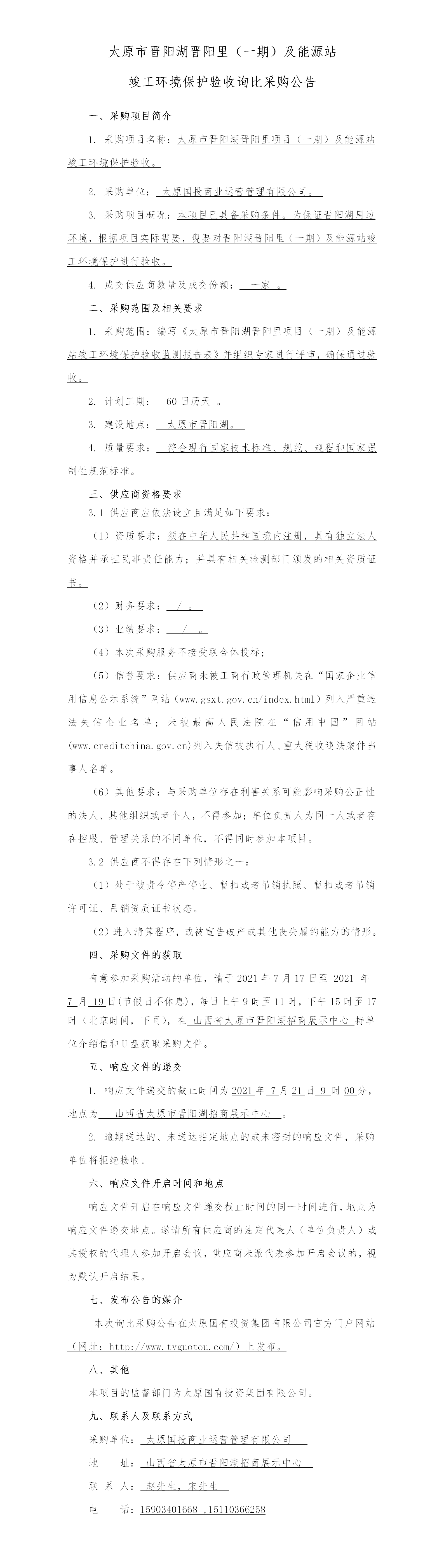 太原市晉陽湖晉陽里(一期)及能源站竣工環(huán)境保護驗收詢比采購公告