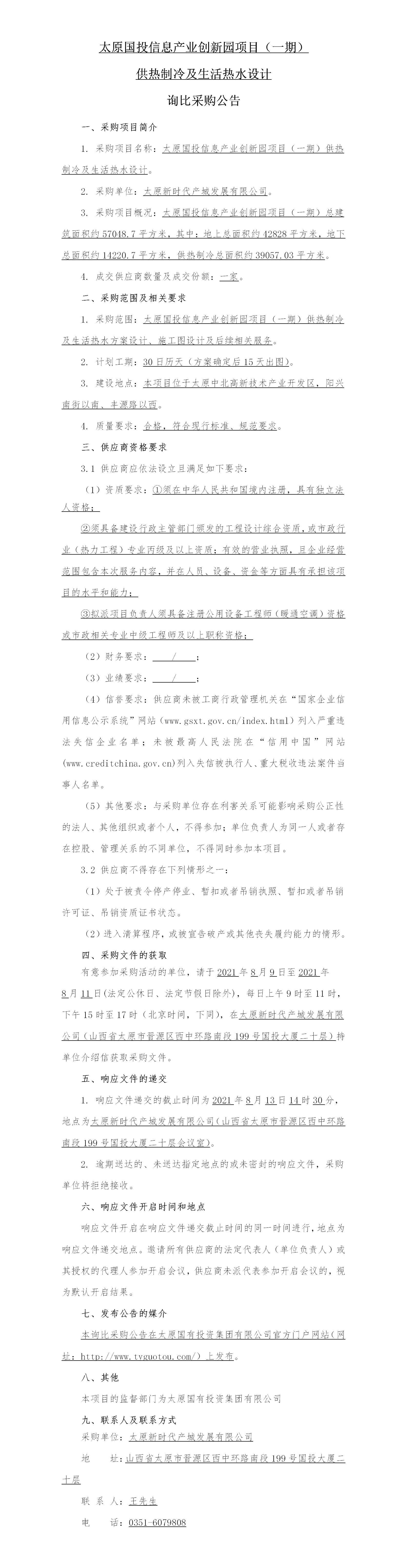 太原國投信息產業(yè)創(chuàng)新園項目(一期)供熱制冷及生活熱水設計詢比采購公告