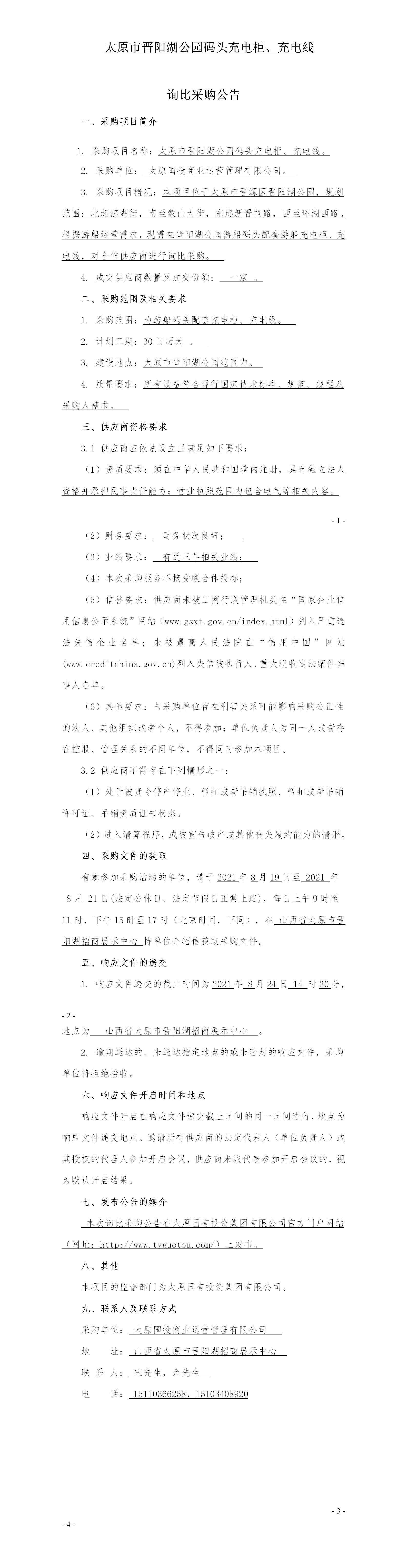太原市晉陽湖公園碼頭充電柜、充電線詢比采購公告