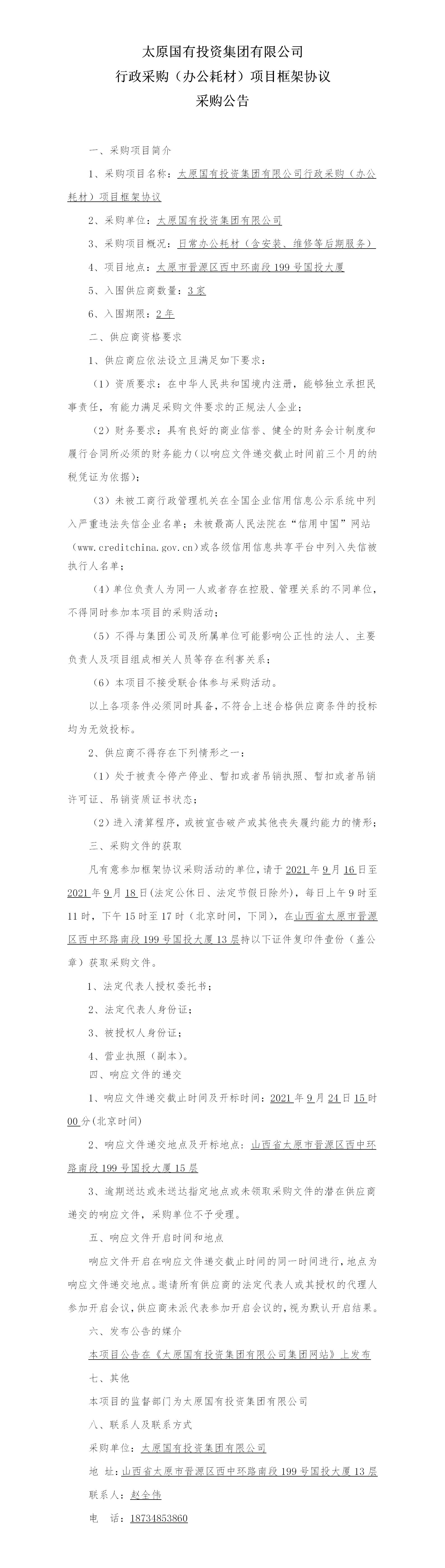 太原國有投資集團(tuán)有限公司行政采購(辦公耗材)項目框架協(xié)議采購公告