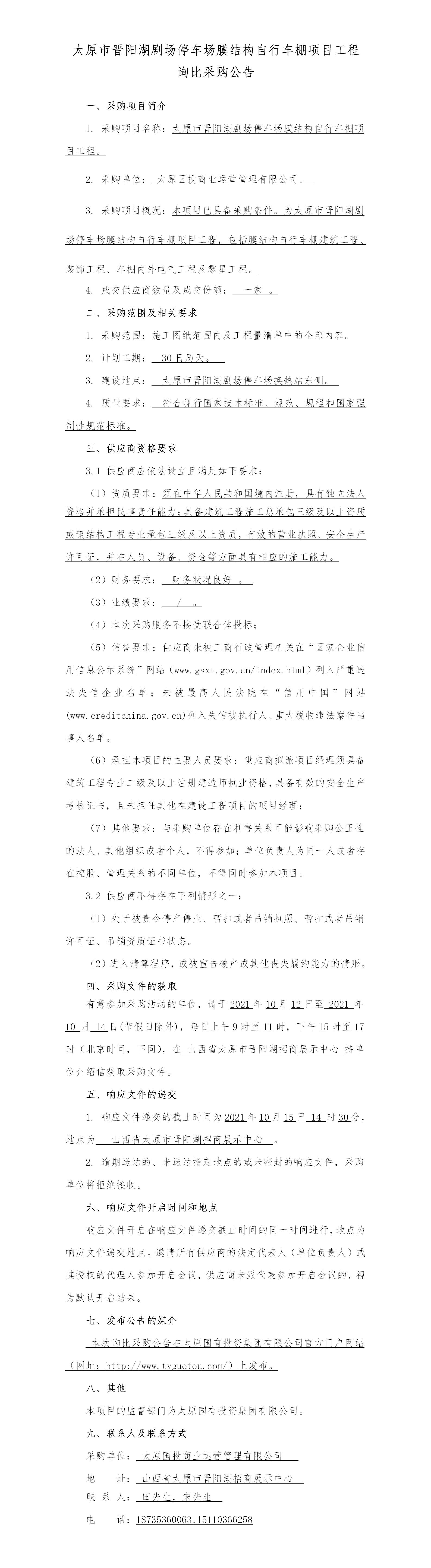 太原市晉陽(yáng)湖劇場(chǎng)停車場(chǎng)膜結(jié)構(gòu)自行車棚項(xiàng)目工程公告
