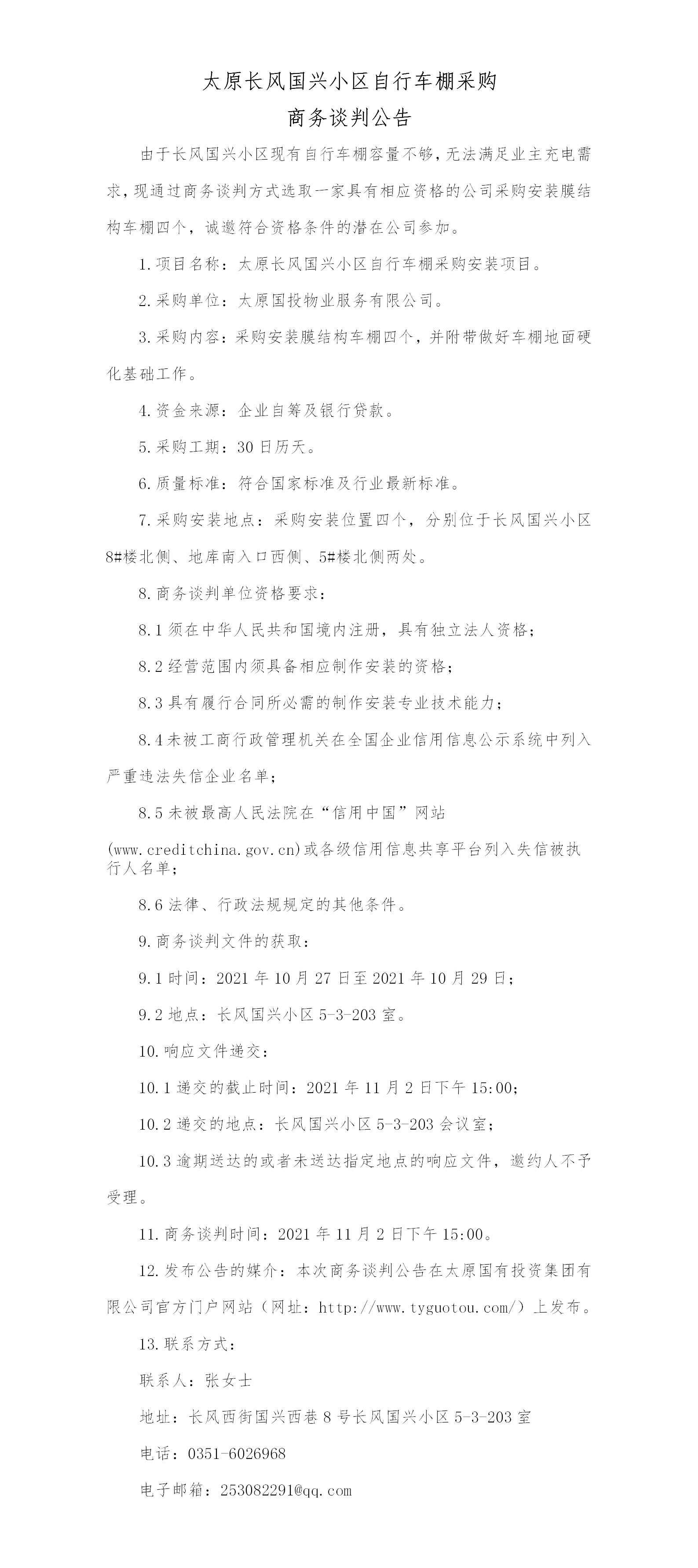 太原長(zhǎng)風(fēng)國(guó)興小區(qū)自行車棚采購(gòu)商務(wù)談判公告