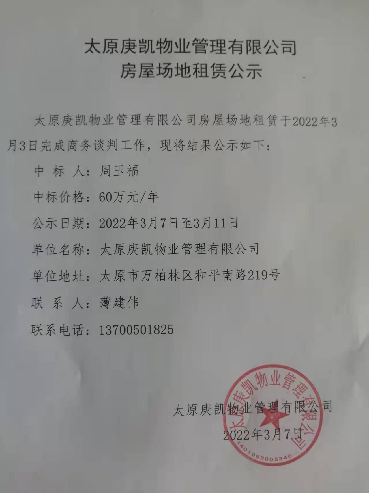 太原庚凱物業(yè)管理有限公司房屋場地租賃公示