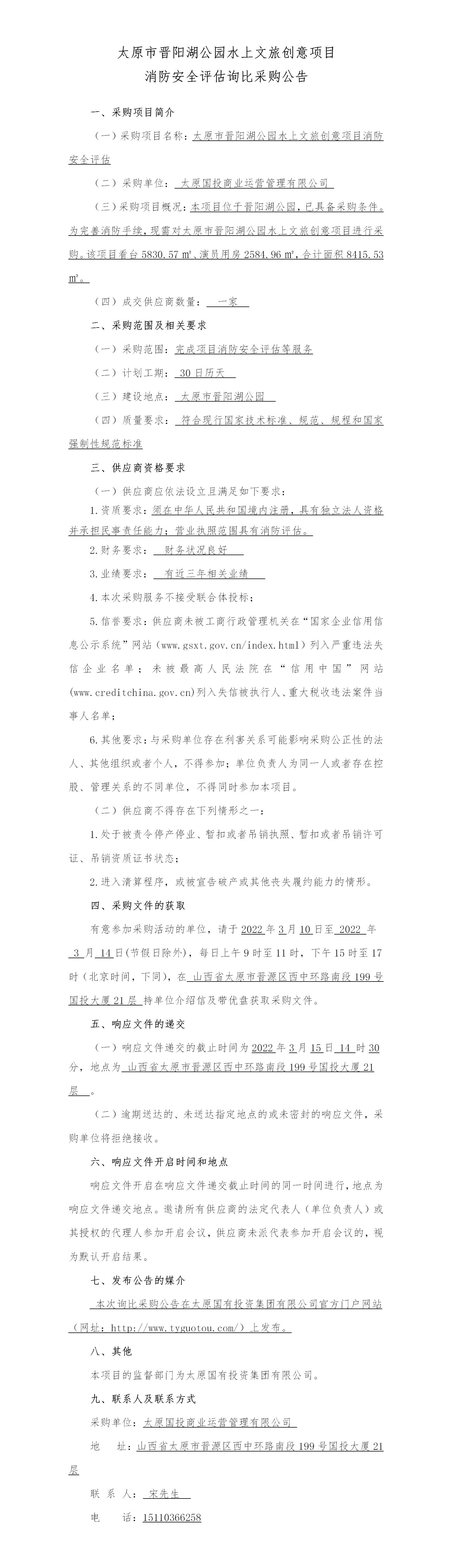 太原市晉陽湖公園水上文旅創(chuàng)意項(xiàng)目消防安全評估詢比采購公告