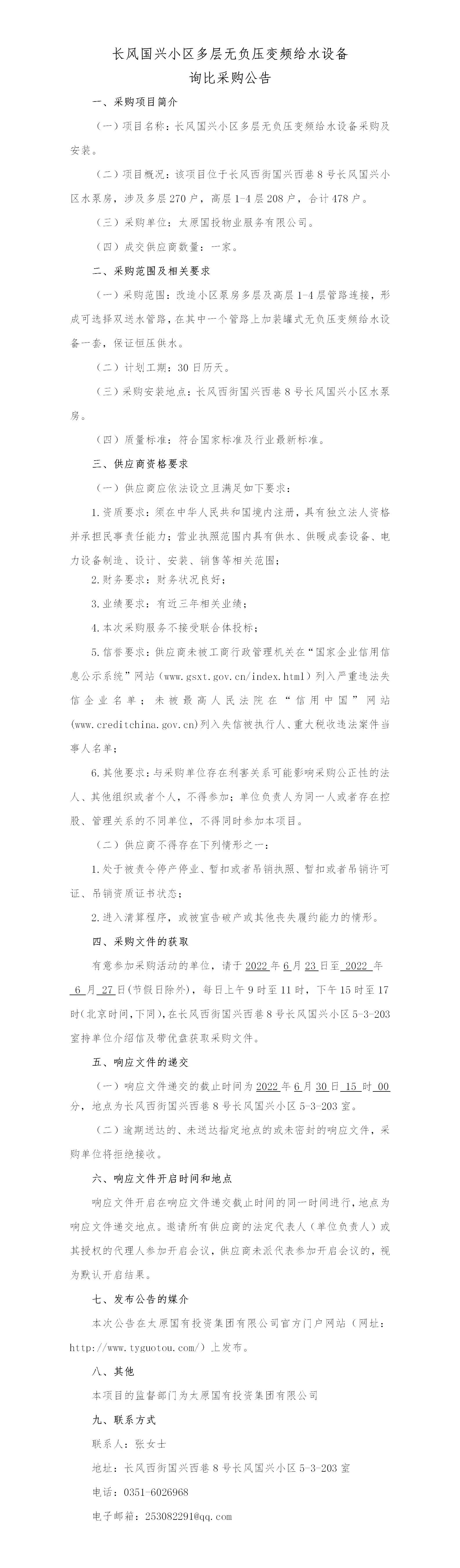 長風(fēng)國興小區(qū)多層無負(fù)壓變頻給水設(shè)備詢比采購公告