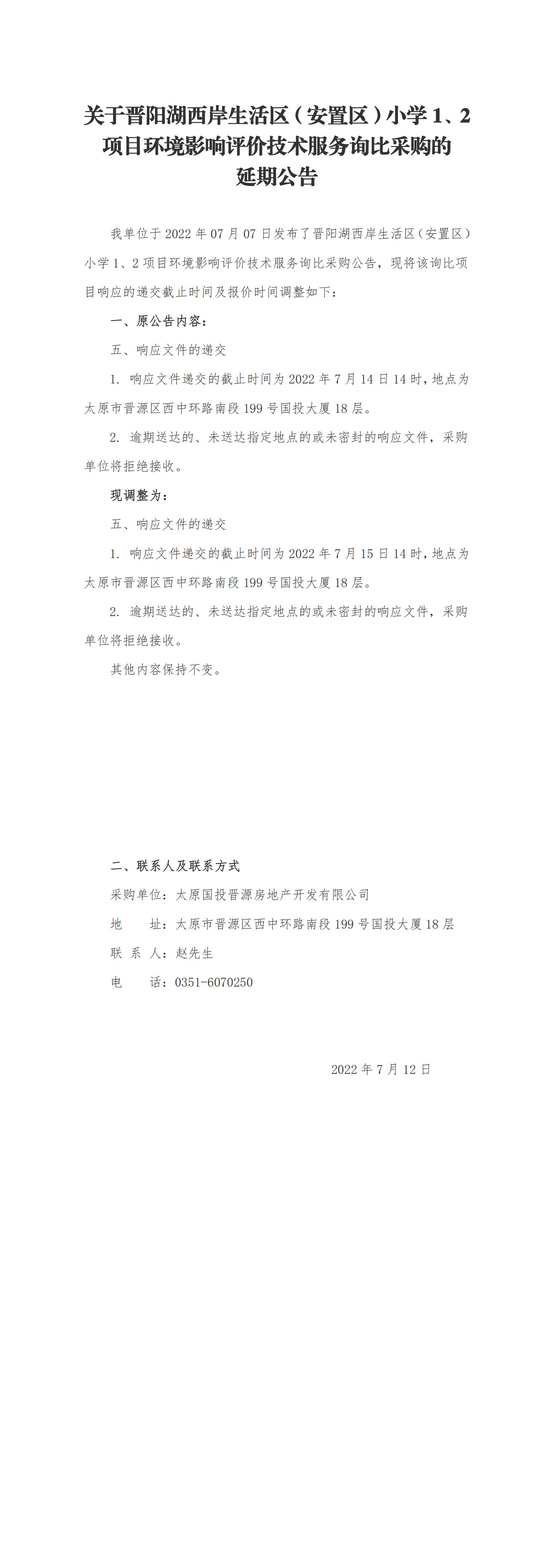 關(guān)于晉陽(yáng)湖西岸生活區(qū)(安置區(qū))小學(xué)1、2項(xiàng)目環(huán)境影響評(píng)價(jià)技術(shù)服務(wù)詢(xún)比采購(gòu)的延期公告
