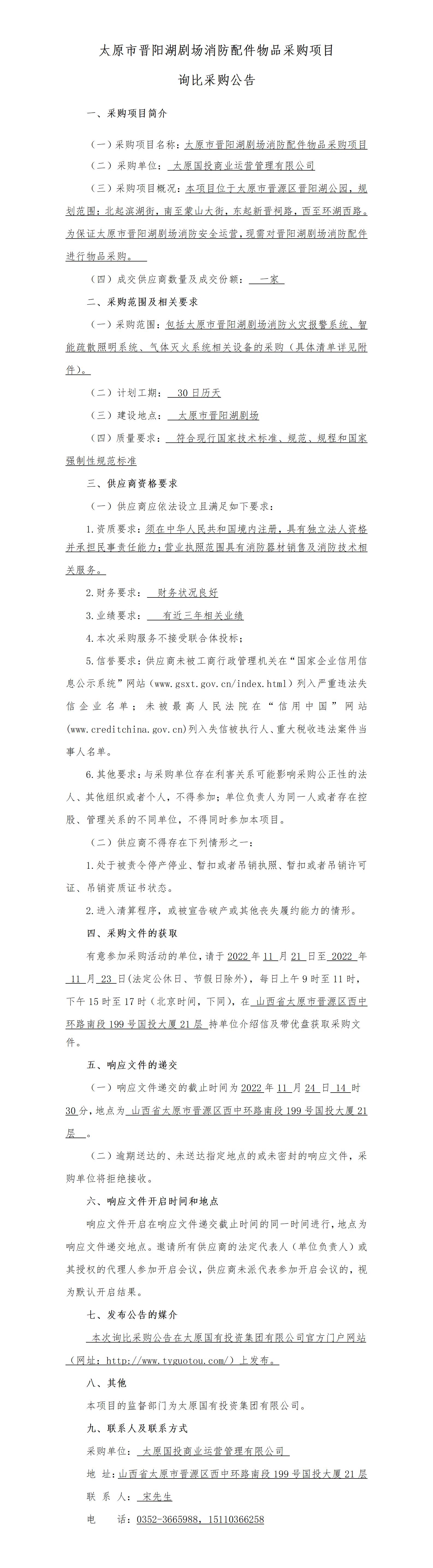太原市晉陽湖劇場消防配件物品采購項(xiàng)目詢比采購公告
