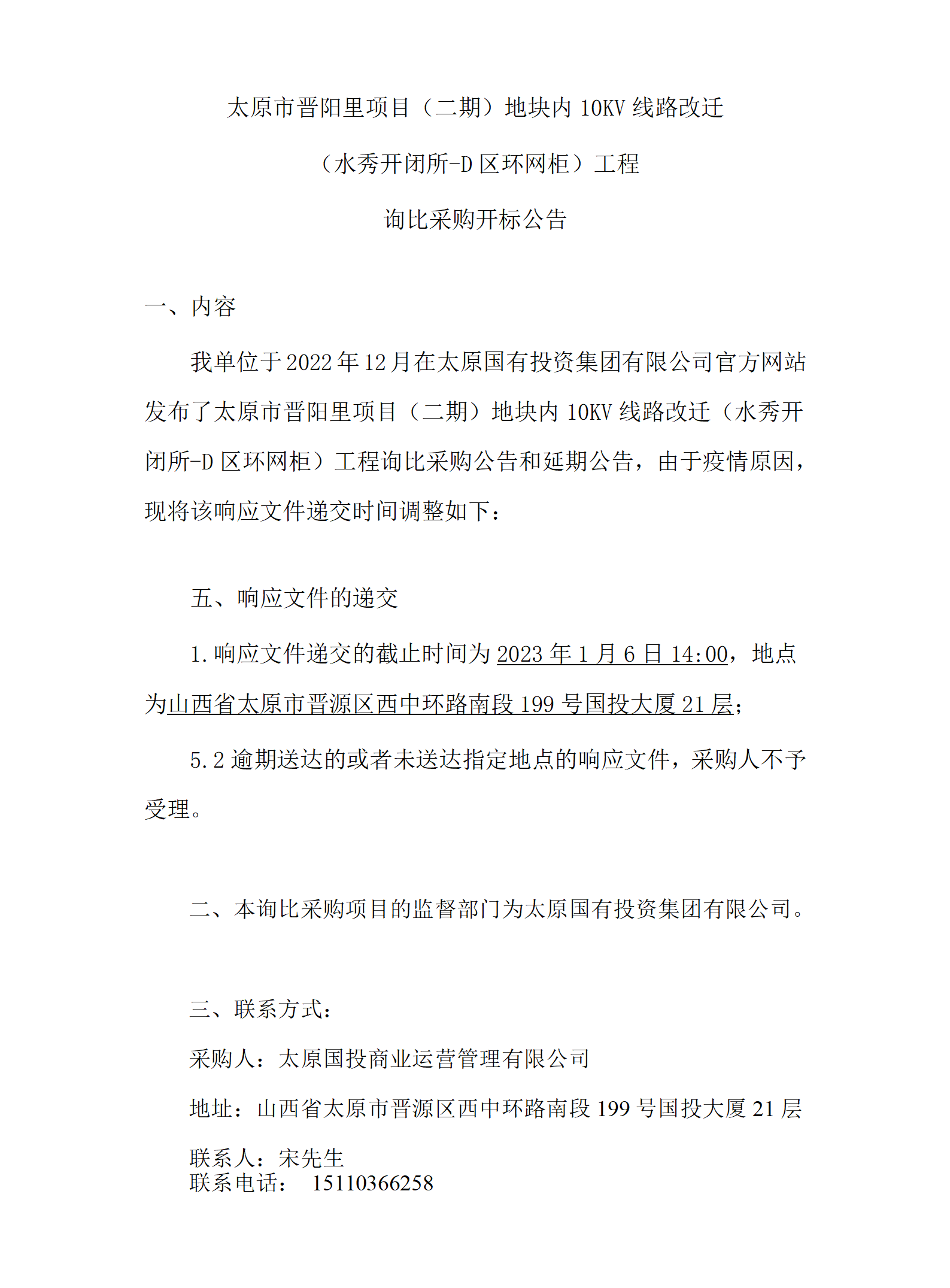 太原市晉陽(yáng)里項(xiàng)目(二期)地塊內(nèi)10KV線路改遷(水秀開(kāi)閉所-D區(qū)環(huán)網(wǎng)柜)工程詢比采購(gòu)開(kāi)標(biāo)公告