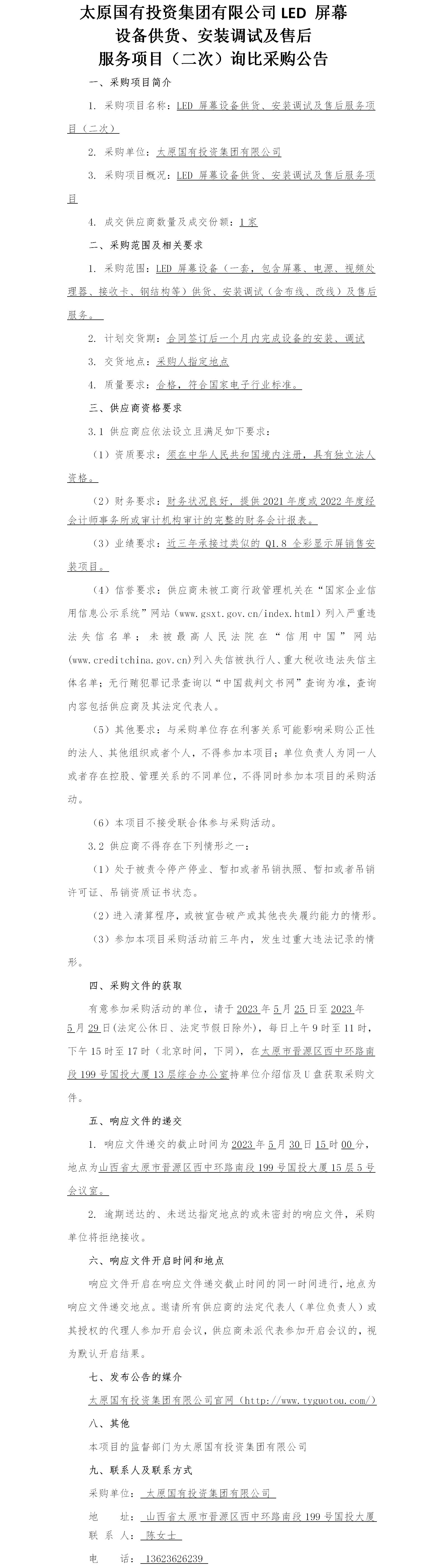 太原國有投資集團(tuán)有限公司LED 屏幕設(shè)備供貨、安裝調(diào)試及售后服務(wù)項目(二次)詢比采購公示