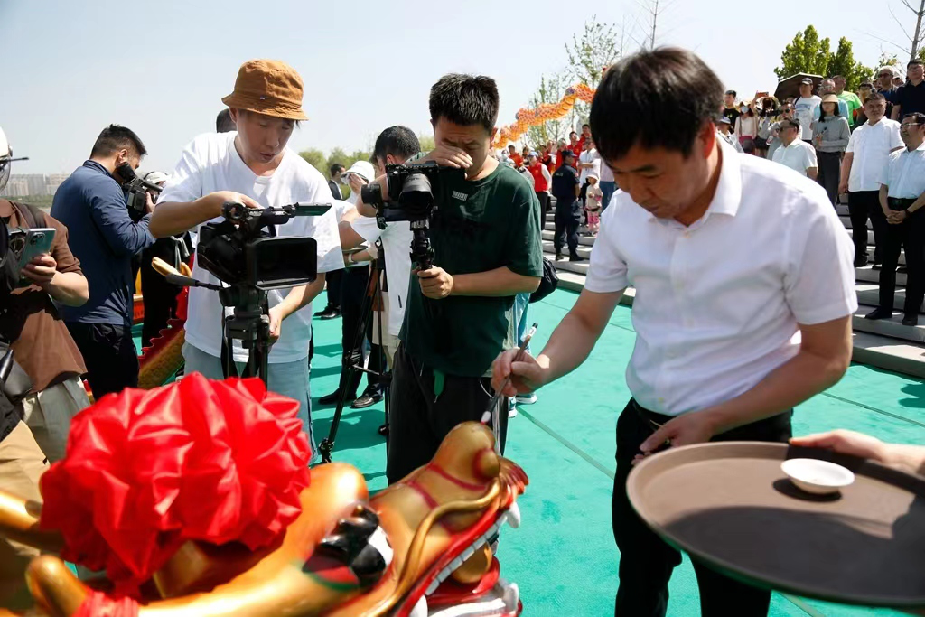 晉源區(qū)委書(shū)記張農(nóng)壽,晉源區(qū)長(zhǎng)張耀,省文旅廳處長(zhǎng)馮海明,國(guó)投集團(tuán)董事長(zhǎng)蘭衛(wèi)軍為本次活動(dòng)的龍舟“披紅點(diǎn)睛”,一點(diǎn)天庭,吉星高照,鴻運(yùn)當(dāng)頭;二點(diǎn)龍鼻,和諧幸福,萬(wàn)家平安;三點(diǎn)口利,笑口常開(kāi),大吉大利;四點(diǎn)龍角,風(fēng)調(diào)雨順,國(guó)泰民安;五點(diǎn)龍睛,愿龍舟為大家?guī)?lái)健康、吉祥和如意。