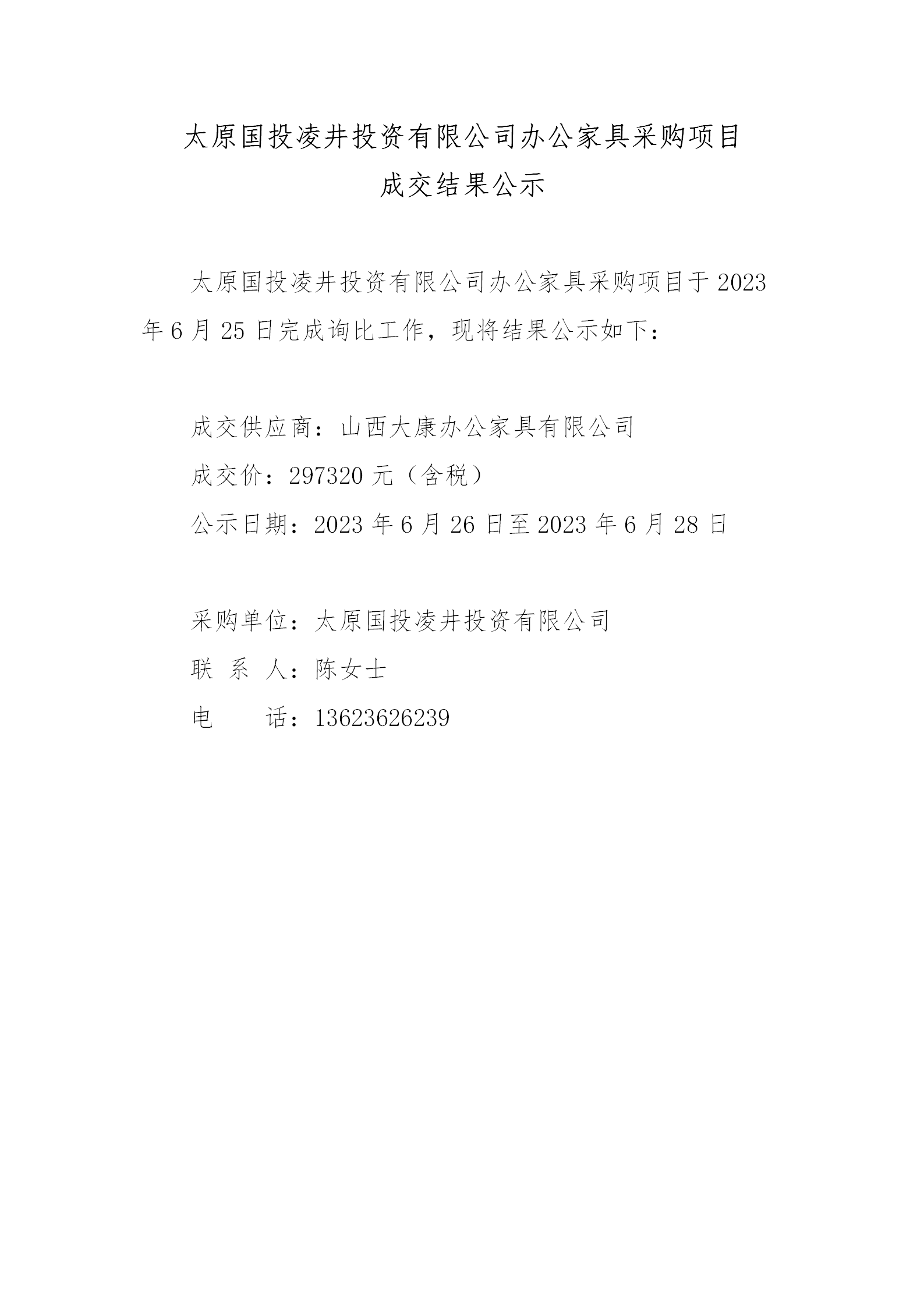太原國投凌井投資有限公司辦公家具采購項(xiàng)目成交結(jié)果公示