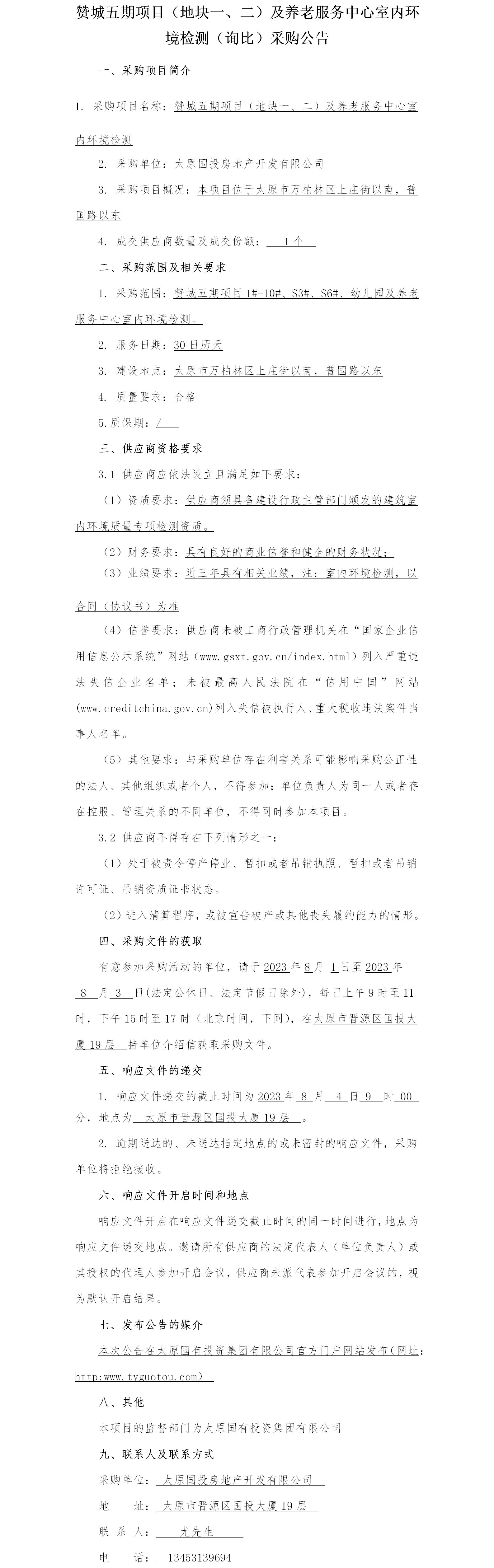 贊城五期項(xiàng)目(地塊一、二)及養(yǎng)老服務(wù)中心室內(nèi)環(huán)境檢測(詢比)采購公告