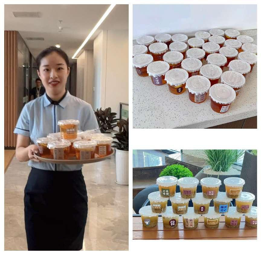 購(gòu)買食材、準(zhǔn)備鍋具、熬制、分裝、貼標(biāo),為愛喝冰的顧客們準(zhǔn)備了冰塊,過(guò)程雖不繁雜,但每一杯都用心制作,每一杯夏飲都飽含她們濃濃的祝福與服務(wù)熱情,送夏飲現(xiàn)場(chǎng),收獲的一聲聲“謝謝”,就是物業(yè)人工作的最大動(dòng)力。