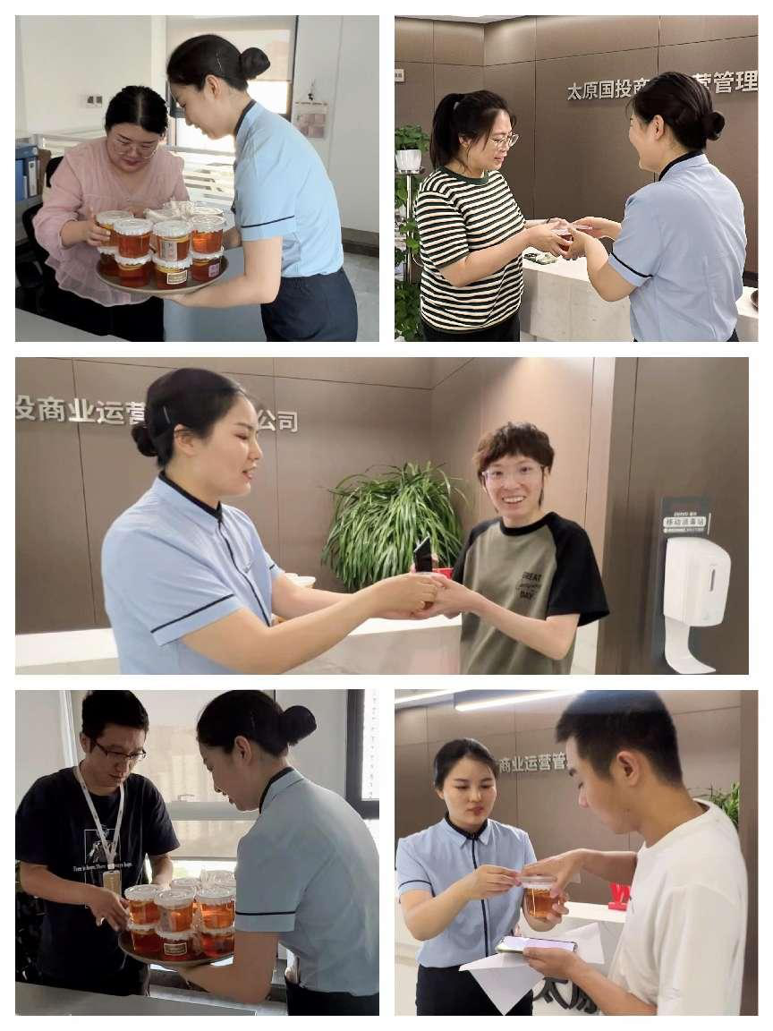 連日的高溫,驕陽(yáng)似火,來(lái)一杯酸甜可口的冰鎮(zhèn)檸檬紅茶,不僅可以健脾開胃,更能提神解暑。為讓廣大客戶及一線員工感受到來(lái)自物業(yè)的夏日關(guān)懷,8月8日下午,太原國(guó)投物業(yè)國(guó)投大廈項(xiàng)目客戶服務(wù)人員將自制的夏飲茶,送到樓層辦公人員及一線員工手中,為他們送去酷暑中的一絲清涼。