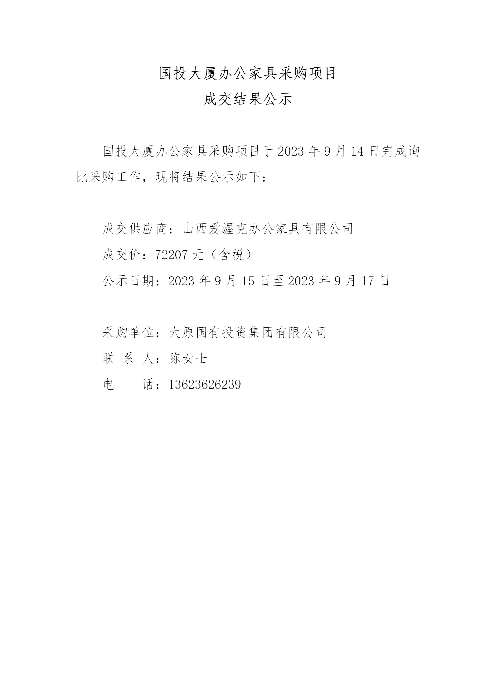 國投大廈辦公家具采購項目成交結(jié)果公示