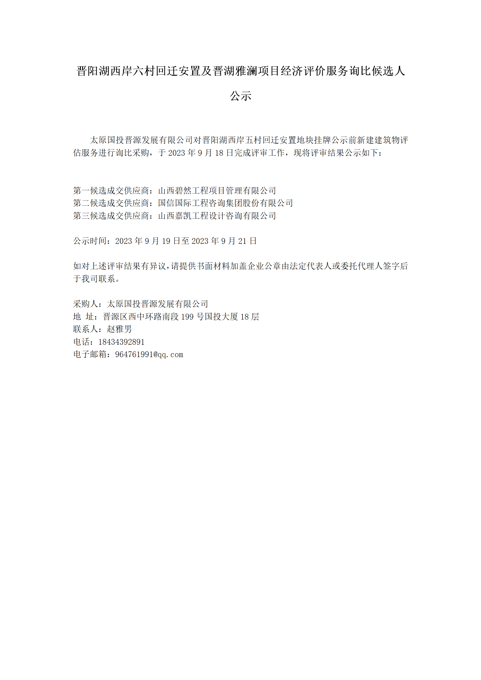 晉陽(yáng)湖西岸六村回遷安置及晉湖雅瀾項(xiàng)目經(jīng)濟(jì)評(píng)價(jià)服務(wù)詢比候選人公示
