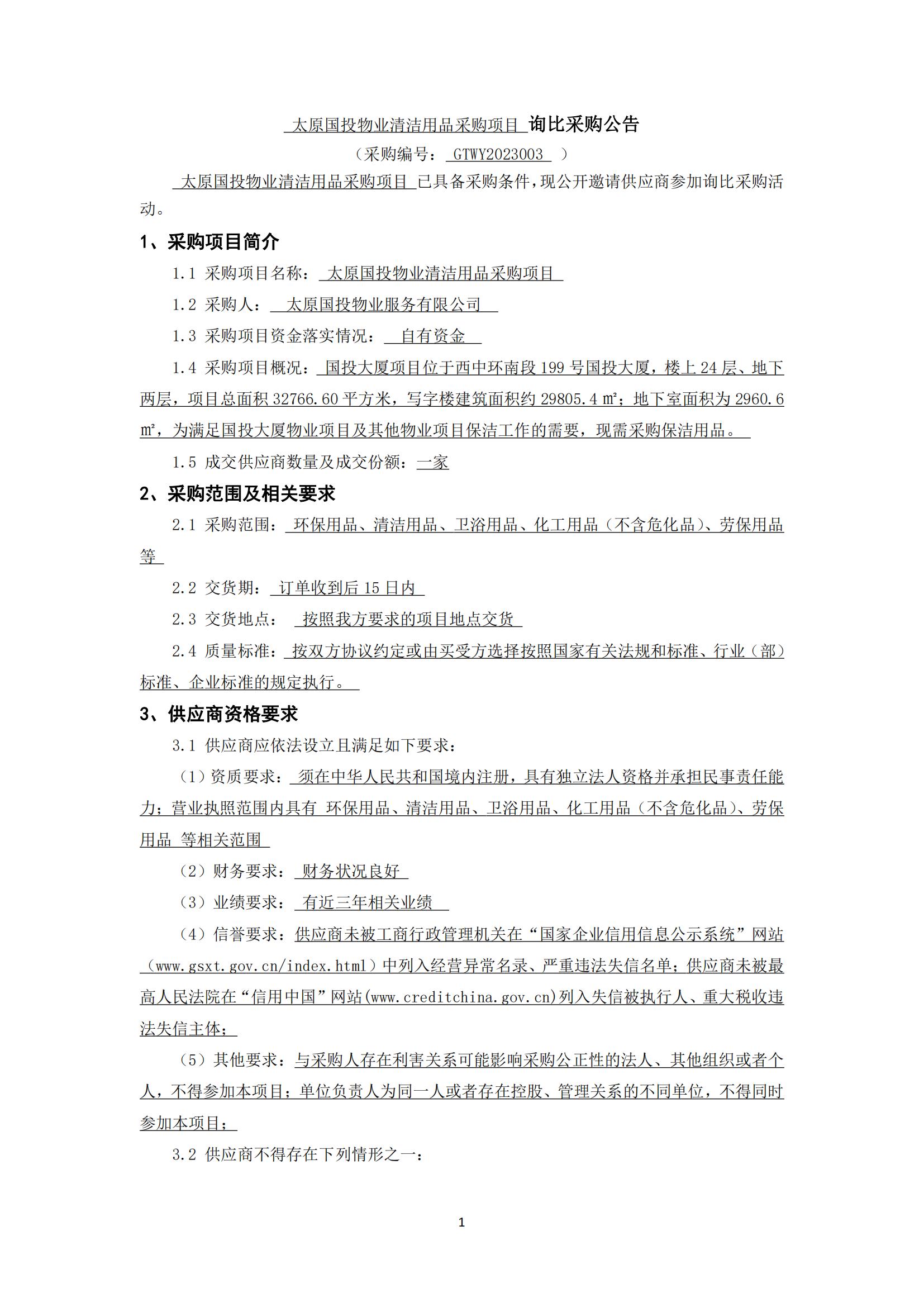 太原國投物業(yè)清潔用品采購項目詢比公告