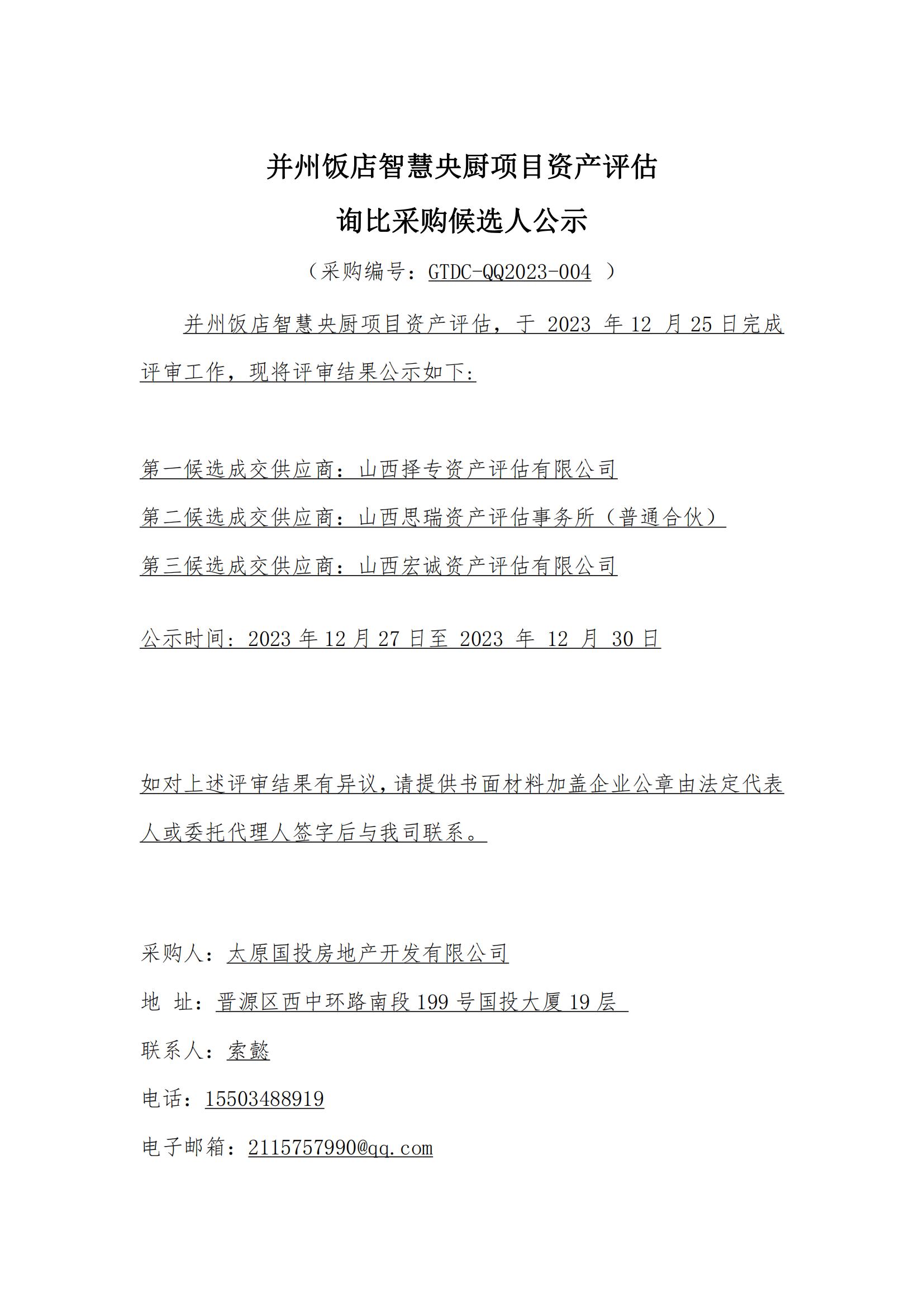 并州飯店智慧央廚項目資產評估詢比采購候選人公示