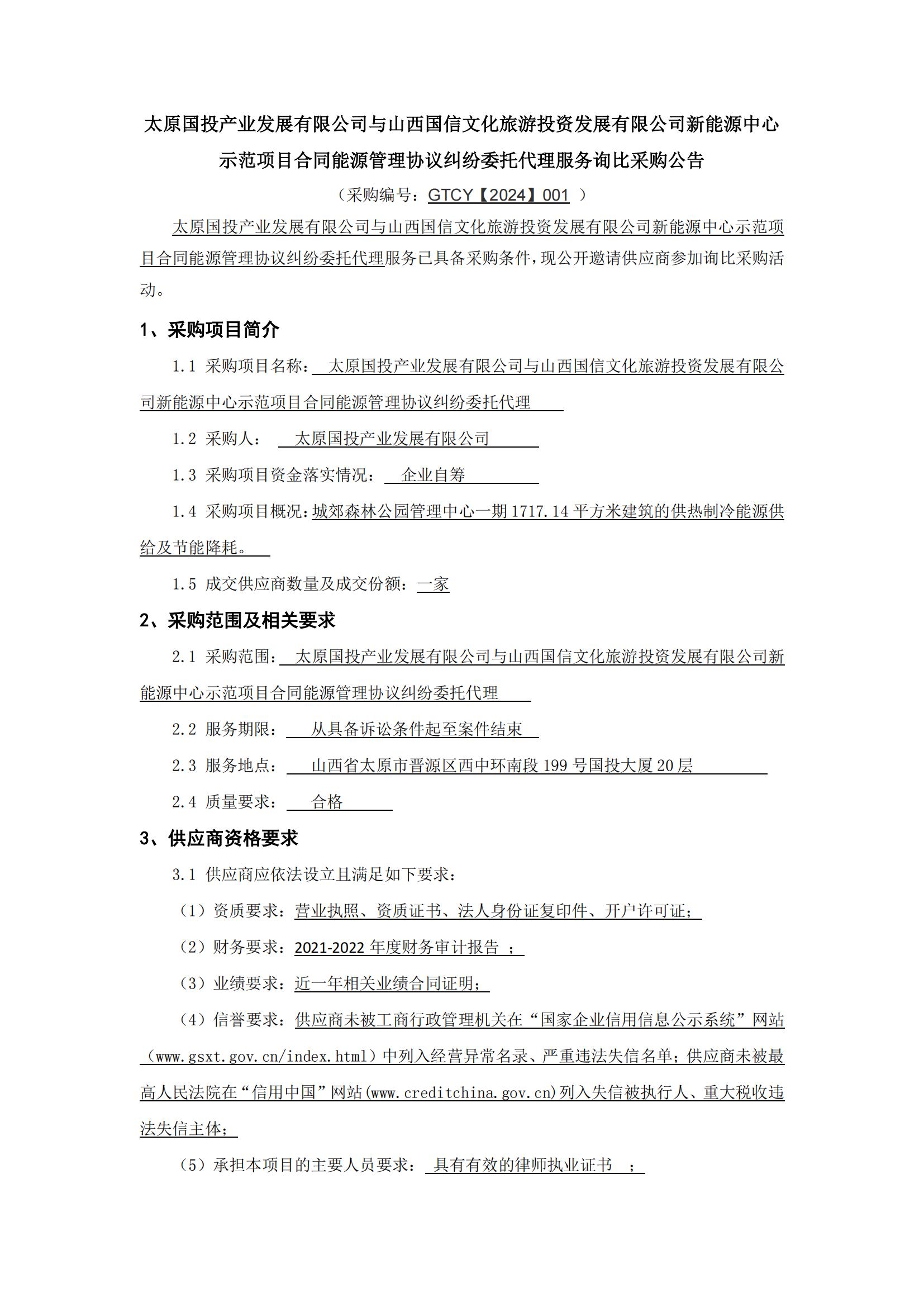 太原國(guó)投產(chǎn)業(yè)發(fā)展有限公司與山西國(guó)信文化旅游投資發(fā)展有限公司新能源中心示范項(xiàng)目合同能源管理協(xié)議糾紛委托代理服務(wù)詢(xún)比采購(gòu)公告