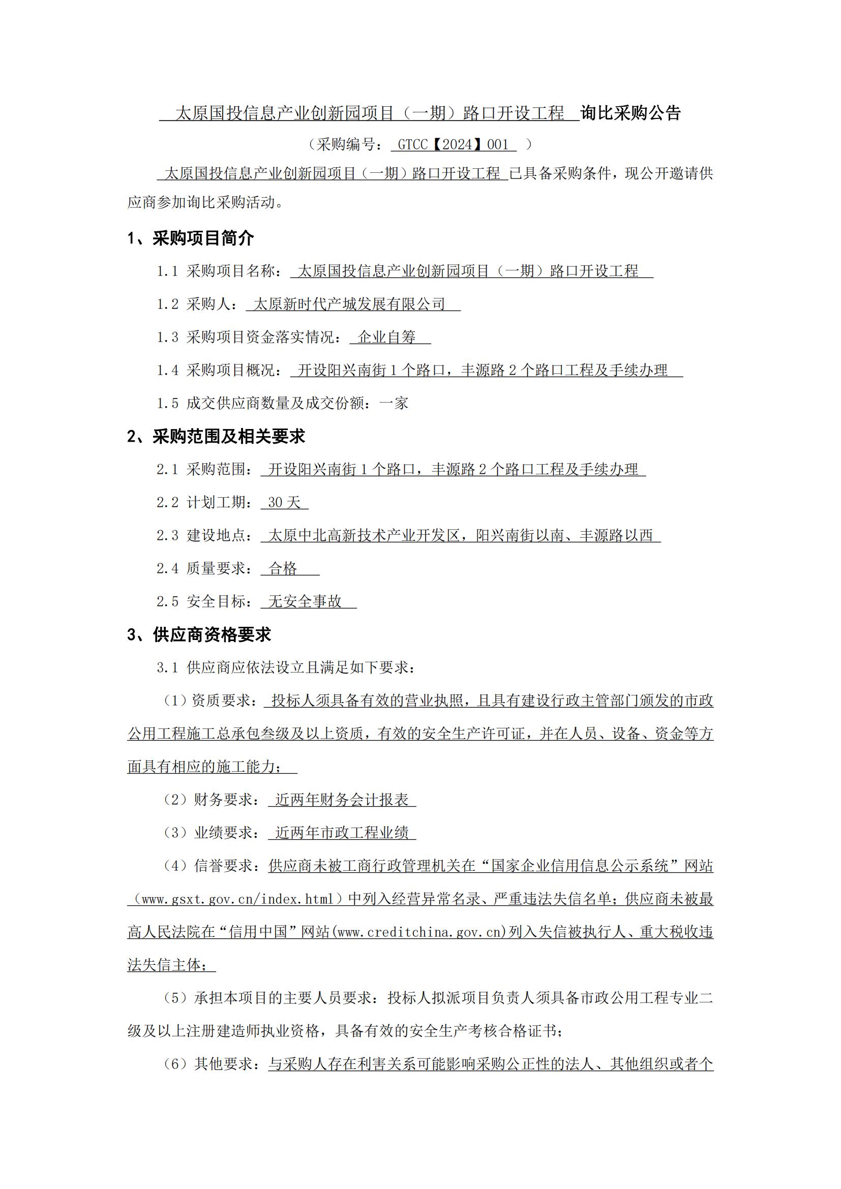 太原國(guó)投信息產(chǎn)業(yè)創(chuàng)新園項(xiàng)目(一期)路口開(kāi)設(shè)工程 詢比采購(gòu)公告