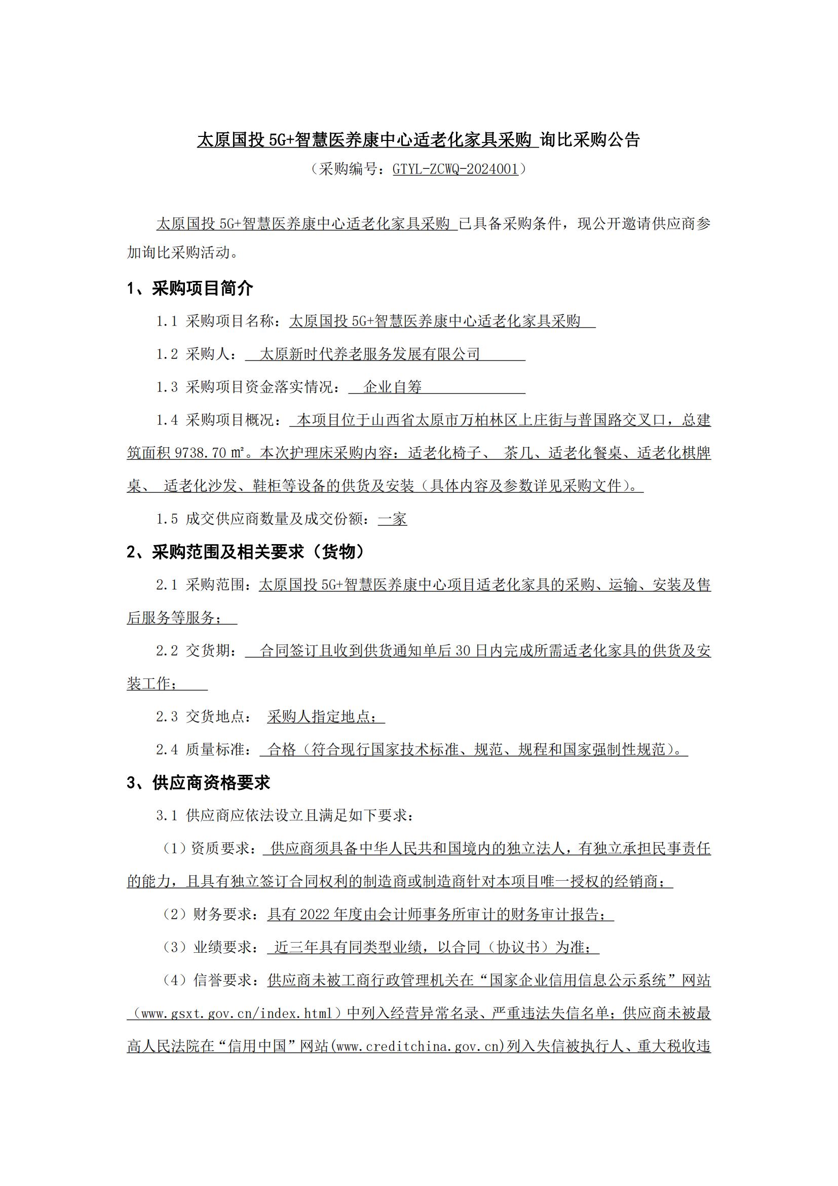 太原國(guó)投5G+智慧醫(yī)養(yǎng)康中心適老化家具采購(gòu) 詢(xún)比采購(gòu)公告