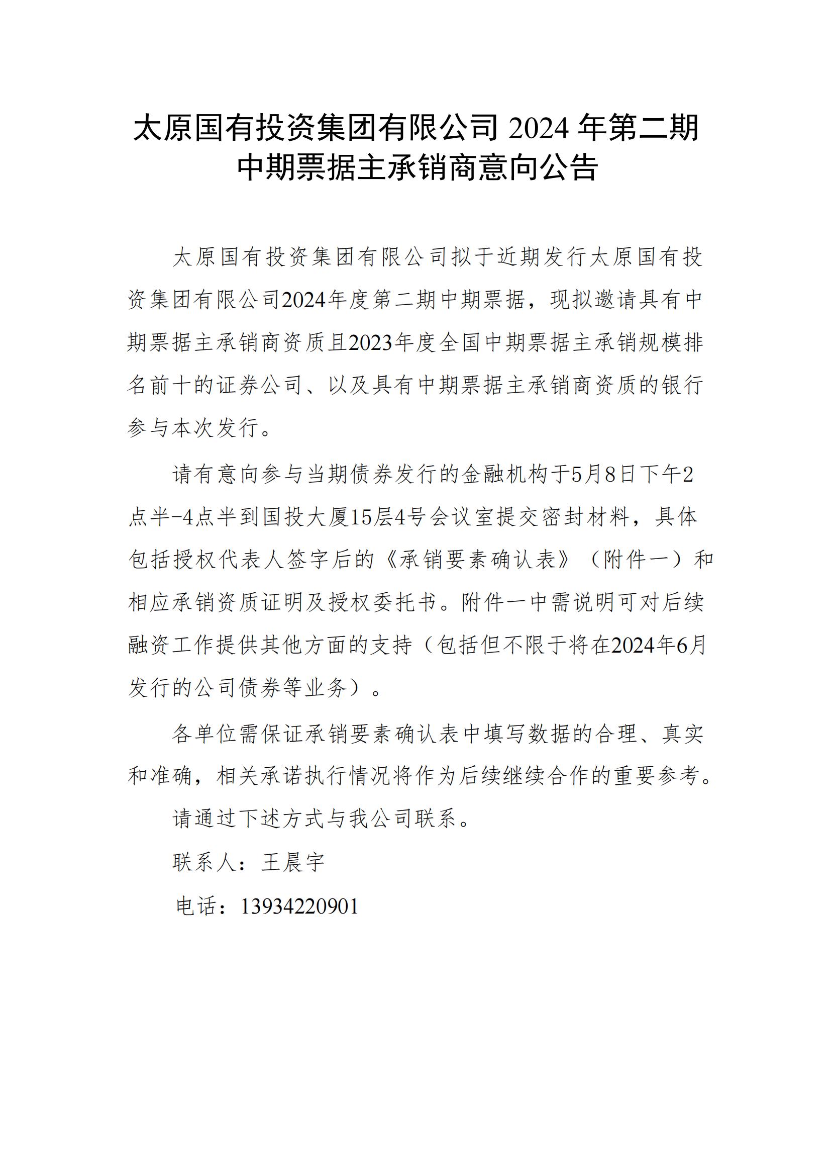 太原國有投資集團(tuán)有限公司2024年第二期中期票據(jù)主承銷商擇選相關(guān)事項的公告