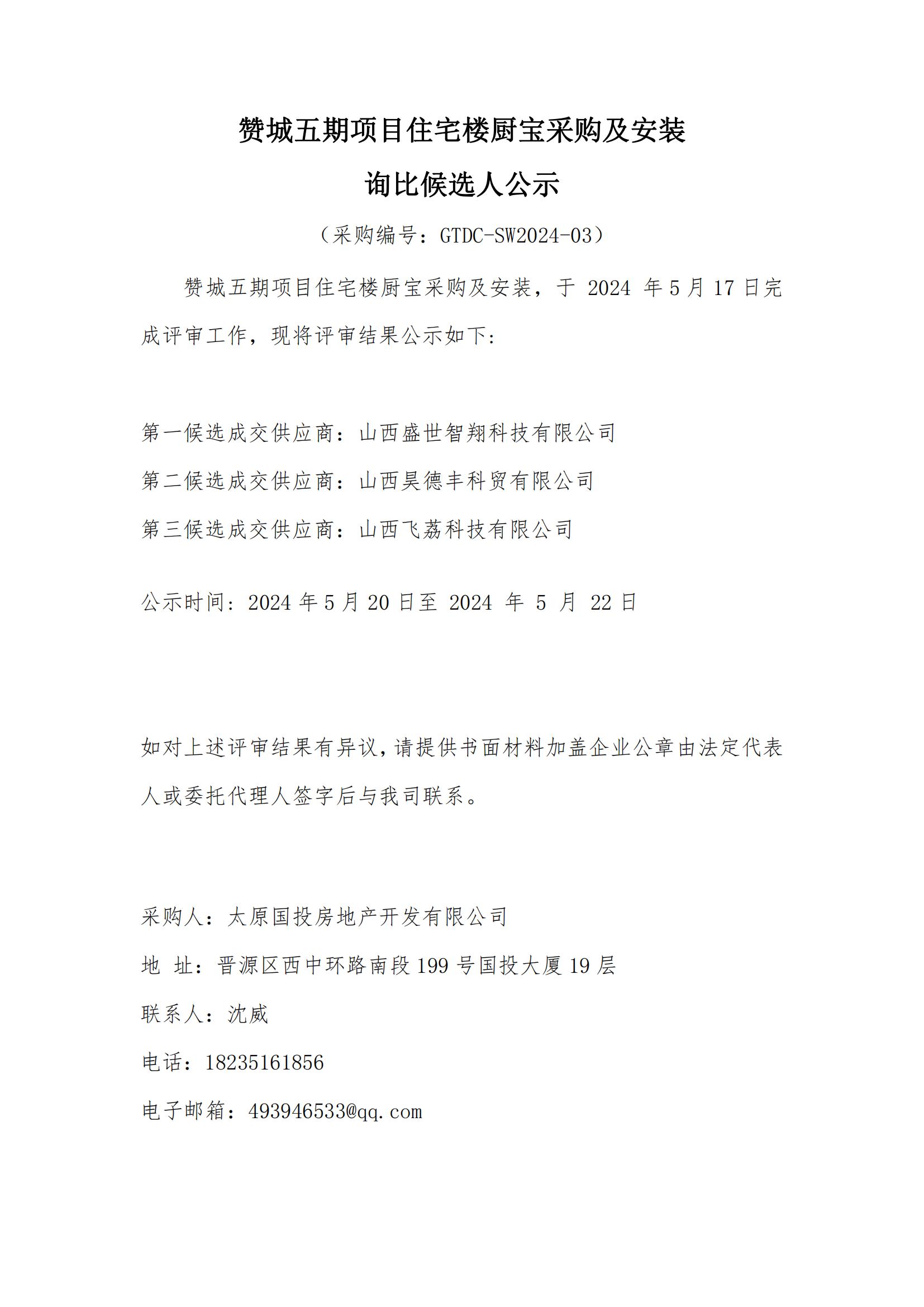 贊城五期項目住宅樓廚寶采購及安裝詢比候選人公示