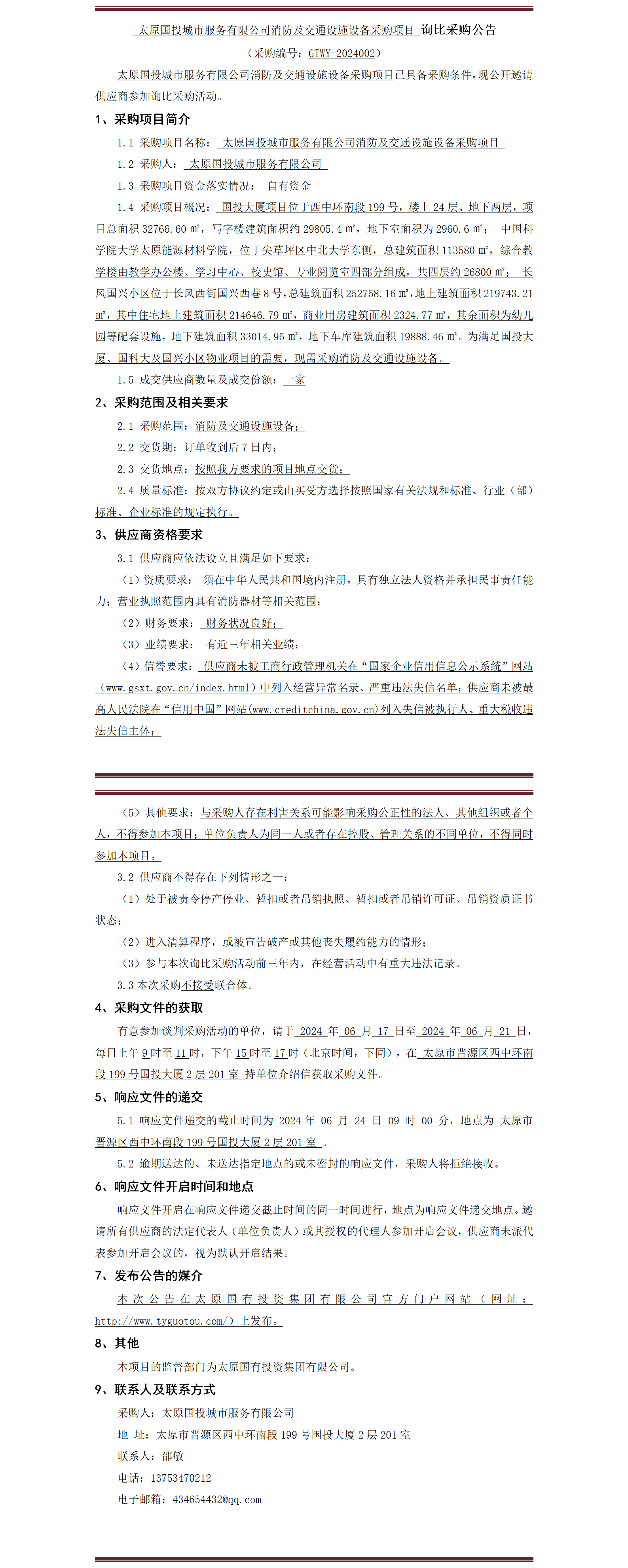 太原國投城市服務(wù)有限公司消防及交通設(shè)施設(shè)備詢比采購公告