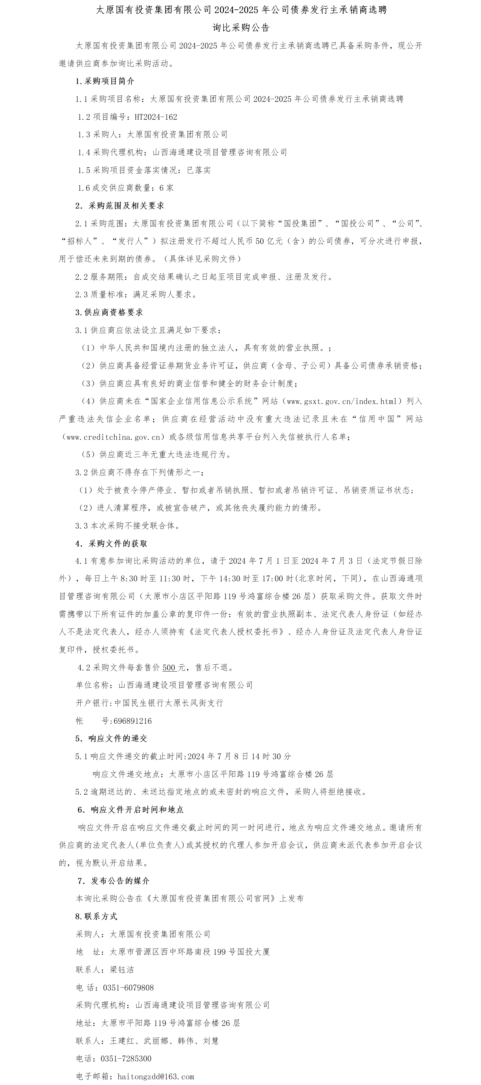 太原國(guó)有投資集團(tuán)有限公司2024-2025年公司債券發(fā)行主承銷商選聘 詢比采購(gòu)公告
