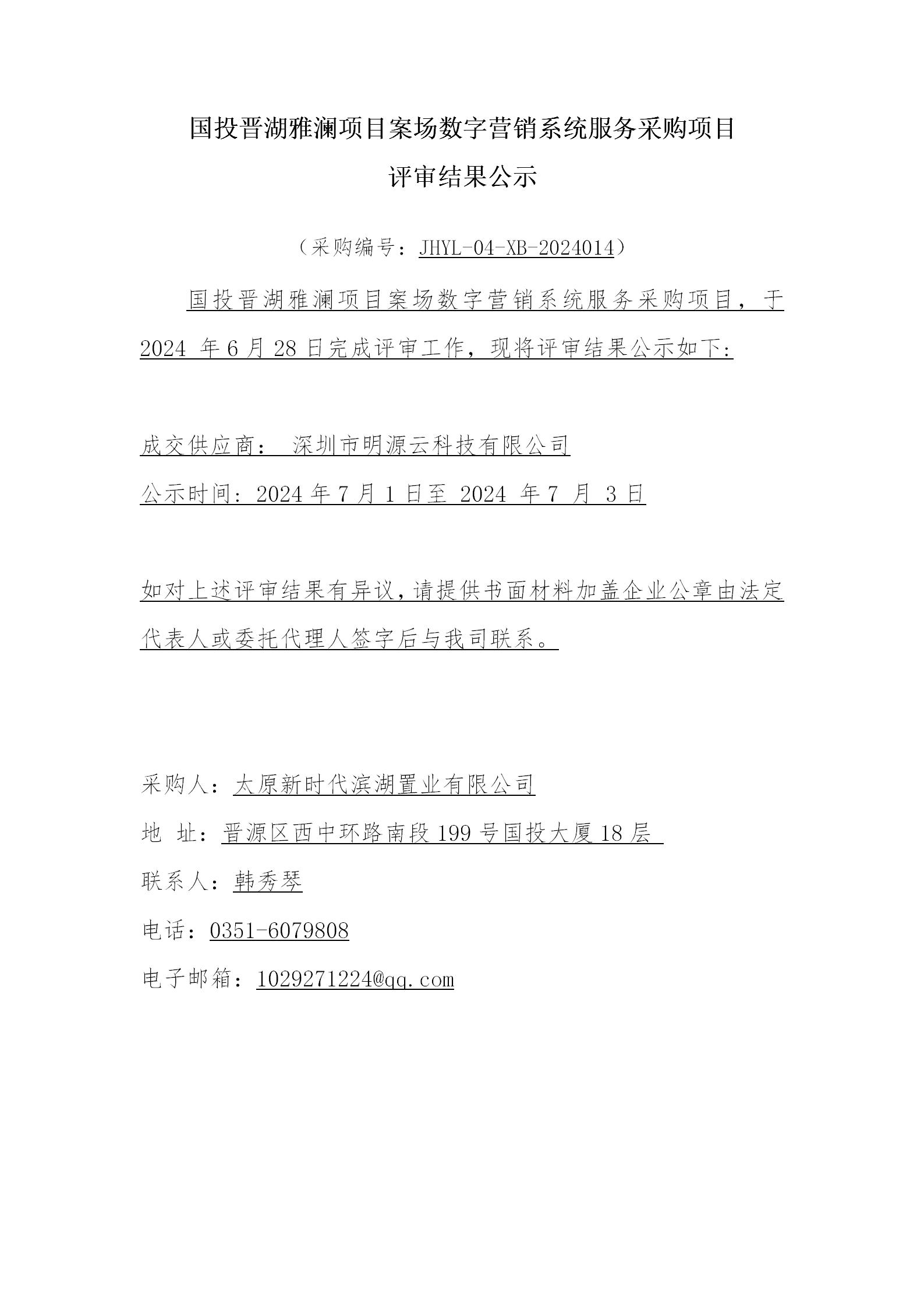 國(guó)投晉湖雅瀾項(xiàng)目案場(chǎng)數(shù)字營(yíng)銷系統(tǒng)采購(gòu)項(xiàng)目評(píng)審結(jié)果公示
