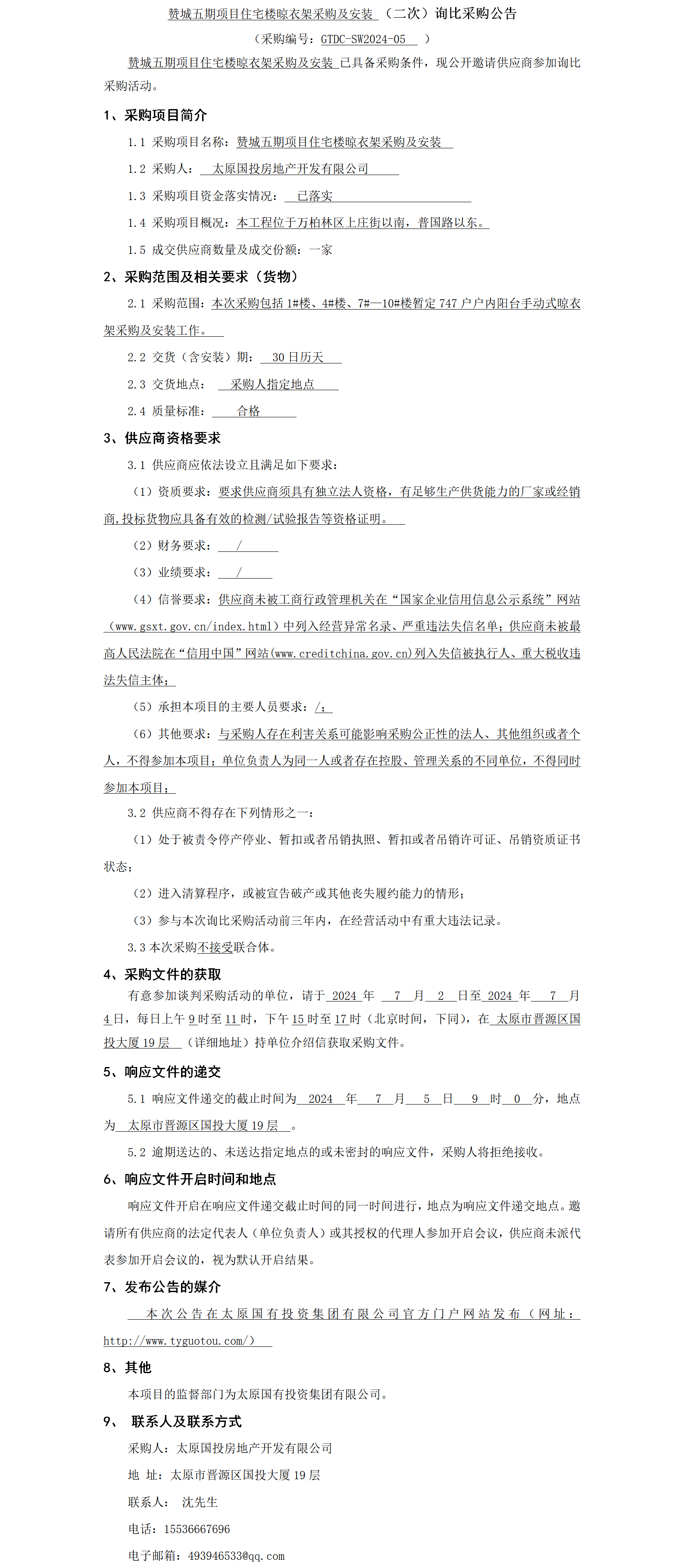 贊城五期項目住宅樓晾衣架采購及安裝(二次)詢比采購公告