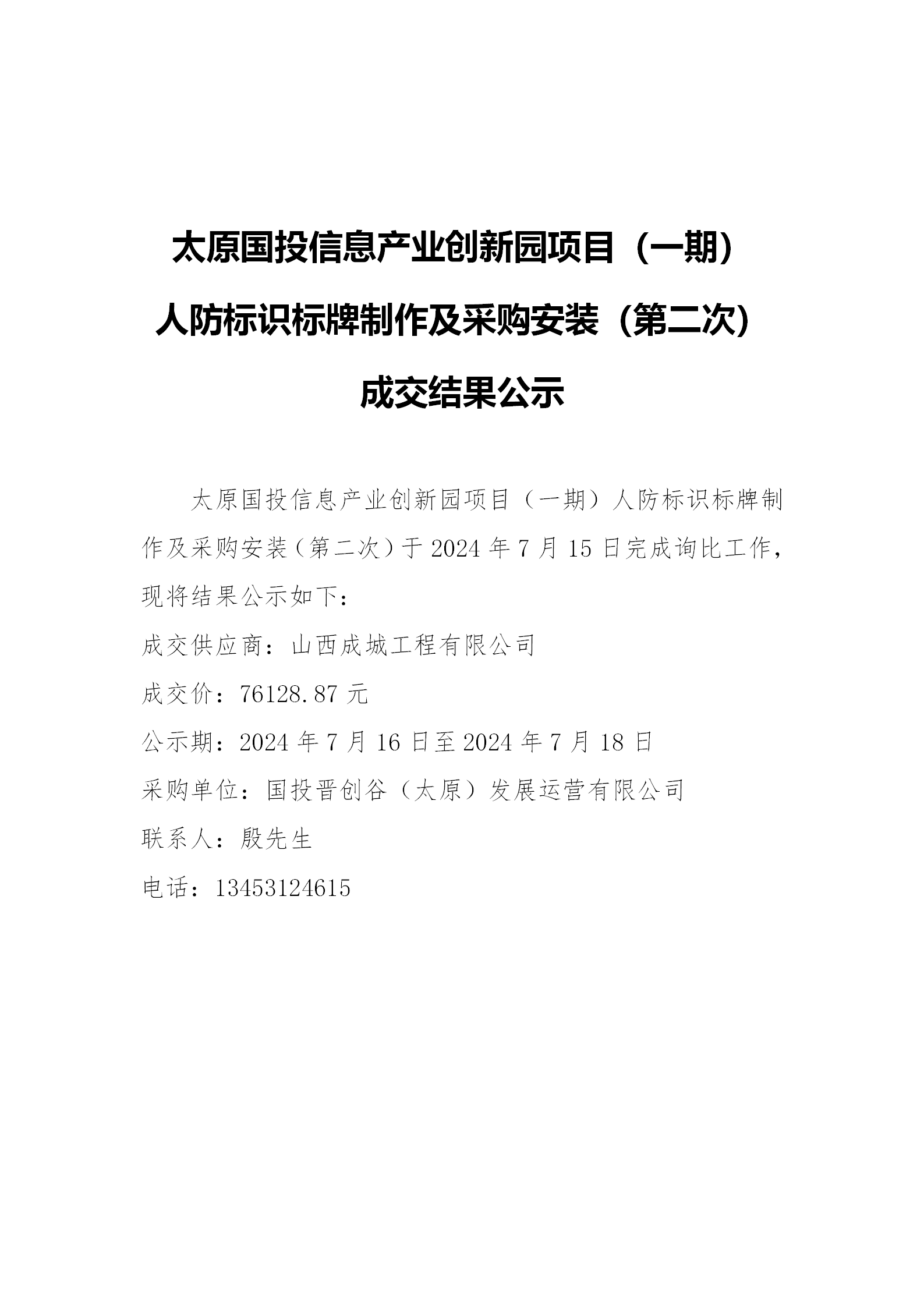 太原國(guó)投信息產(chǎn)業(yè)創(chuàng)新園項(xiàng)目(一期) 人防標(biāo)識(shí)標(biāo)牌制作及采購(gòu)安裝(第二次) 成交結(jié)果公示