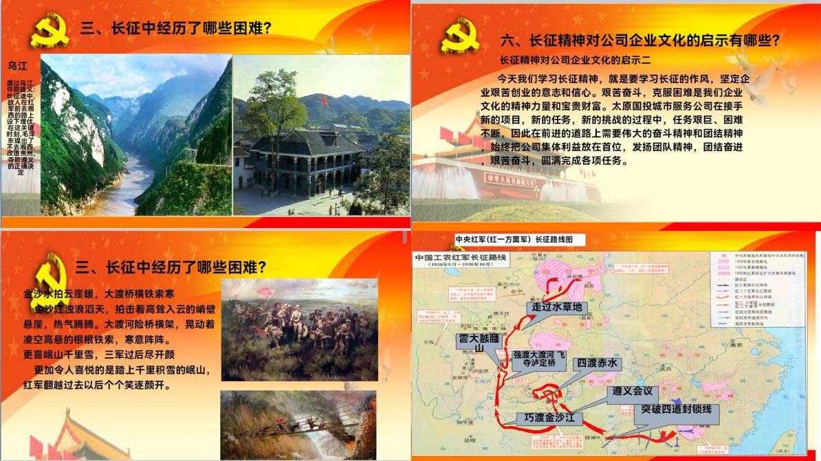 最后,主講人韓成元結(jié)合公司實際,深入探討了長征精神對公司企業(yè)文化的啟示。他提出,公司企業(yè)文化精神與長征精神是一脈相承的,是長征精神在新時代的詮釋。2023年3月,太原國投城市服務(wù)執(zhí)行董事劉冰同志提出了“政治合格、服務(wù)過硬、作風(fēng)優(yōu)良、紀(jì)律嚴(yán)明、保障有力”的企業(yè)文化口號。尤其是作風(fēng)優(yōu)良,是長征精神的重要體現(xiàn),我們將保持積極向上的態(tài)度,勇于面對挑戰(zhàn)和困難、堅定信念、不屈不撓、艱苦奮斗、無私奉獻。
