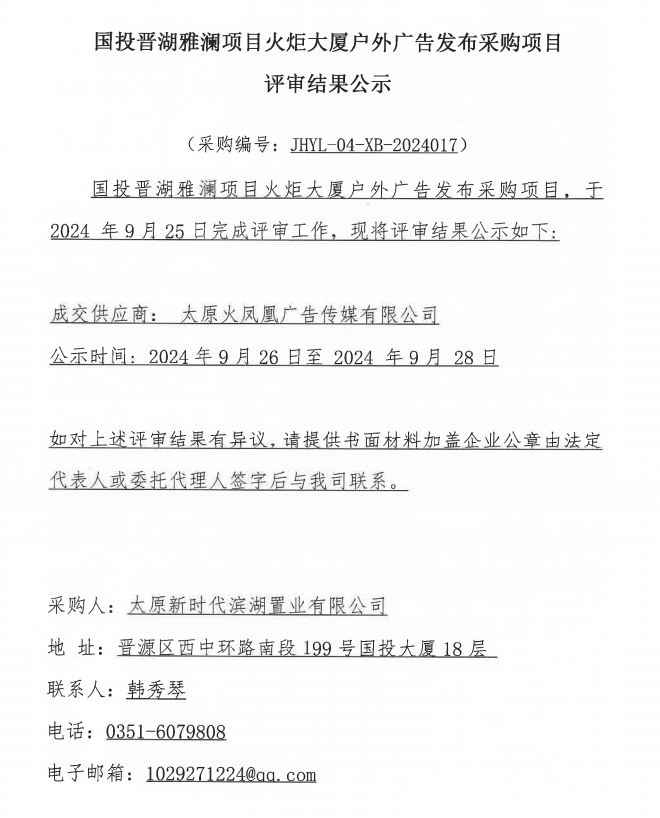 國投晉湖雅瀾項(xiàng)目火炬大廈戶外廣告發(fā)布采購項(xiàng)目評審結(jié)果公示