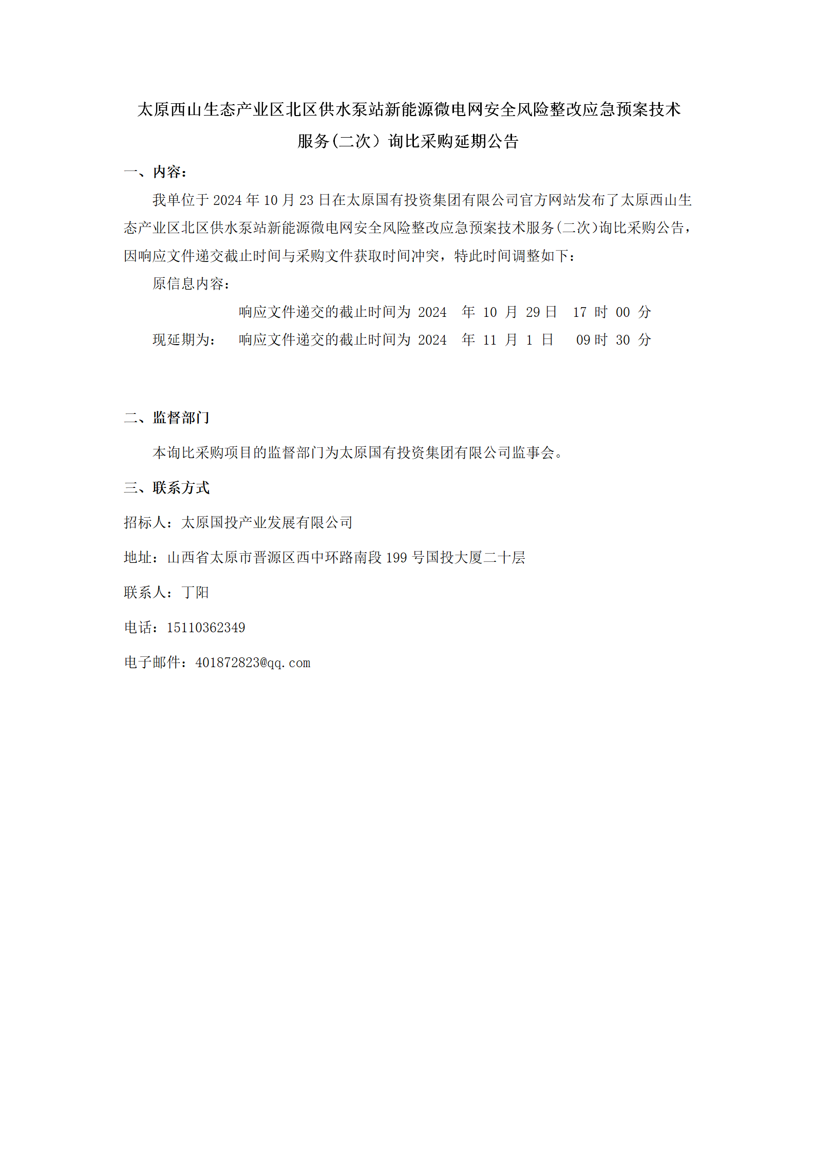 太原西山生態(tài)產(chǎn)業(yè)區(qū)北區(qū)供水泵站新能源微電網(wǎng)安全風(fēng)險(xiǎn)整改應(yīng)急預(yù)案技術(shù)服務(wù)(二次)詢比采購(gòu)延期公告