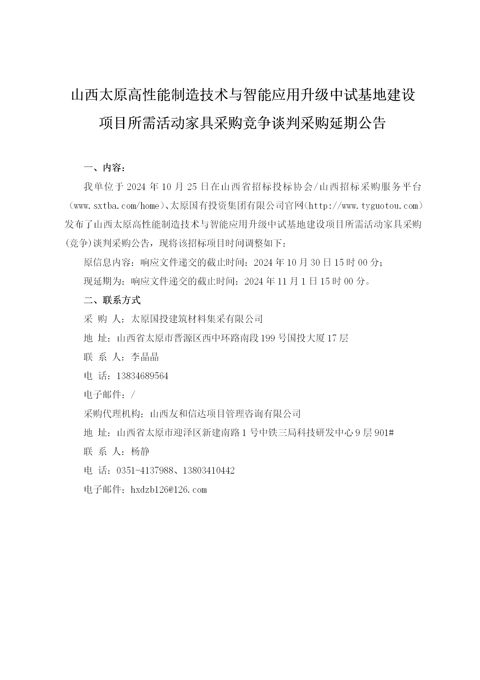 山西太原高性能制造技術(shù)與智能應用升級中試基地建設(shè)項目所需活動家具采購競爭談判采購延期公告