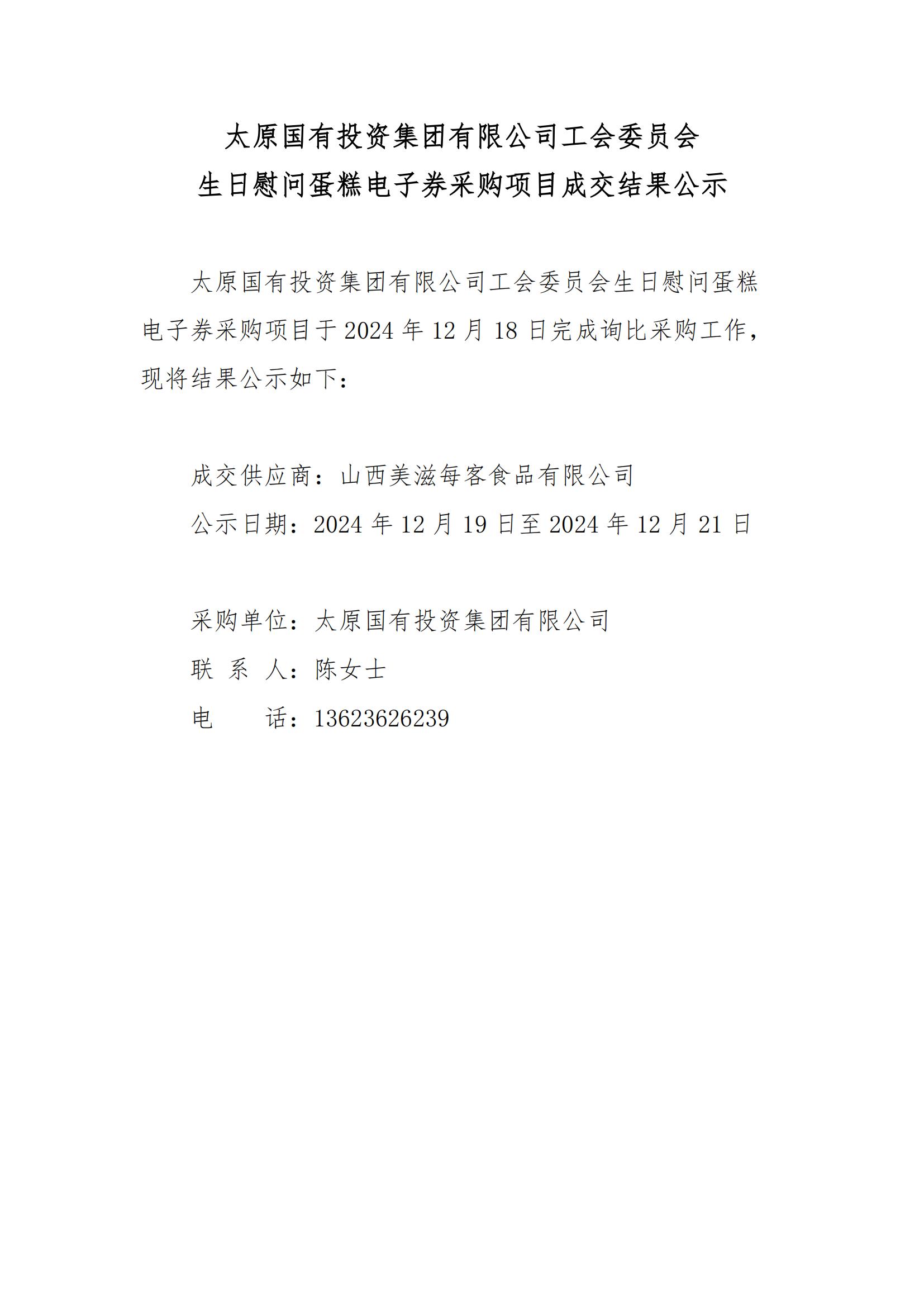 太原國有投資集團有限公司工會委員會生日慰問蛋糕電子券采購項目成交結果公示