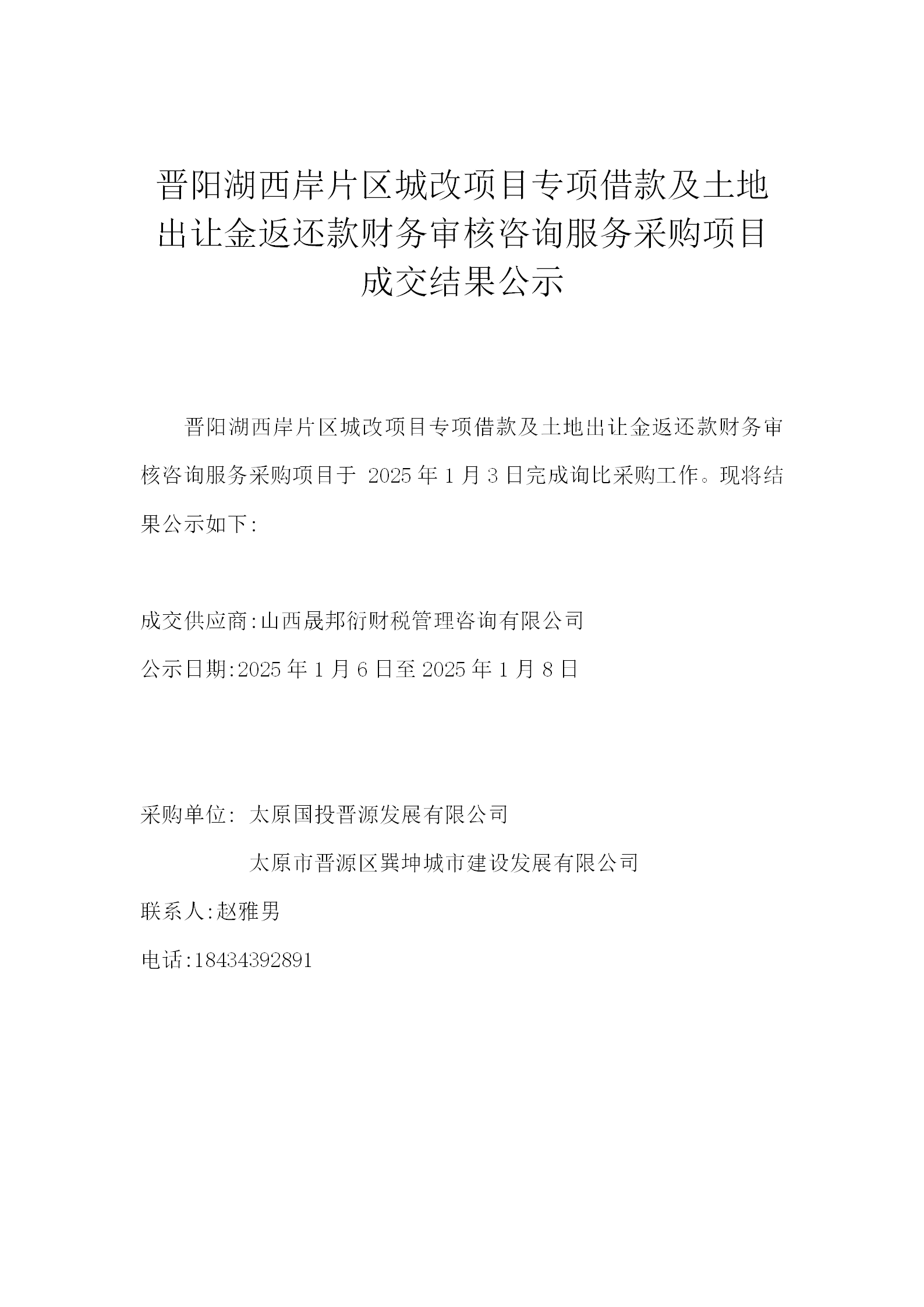 晉陽湖西岸片區(qū)城改項目專項借款及土地出讓金返還款財務(wù)審核咨詢服務(wù)采購項目結(jié)果公示