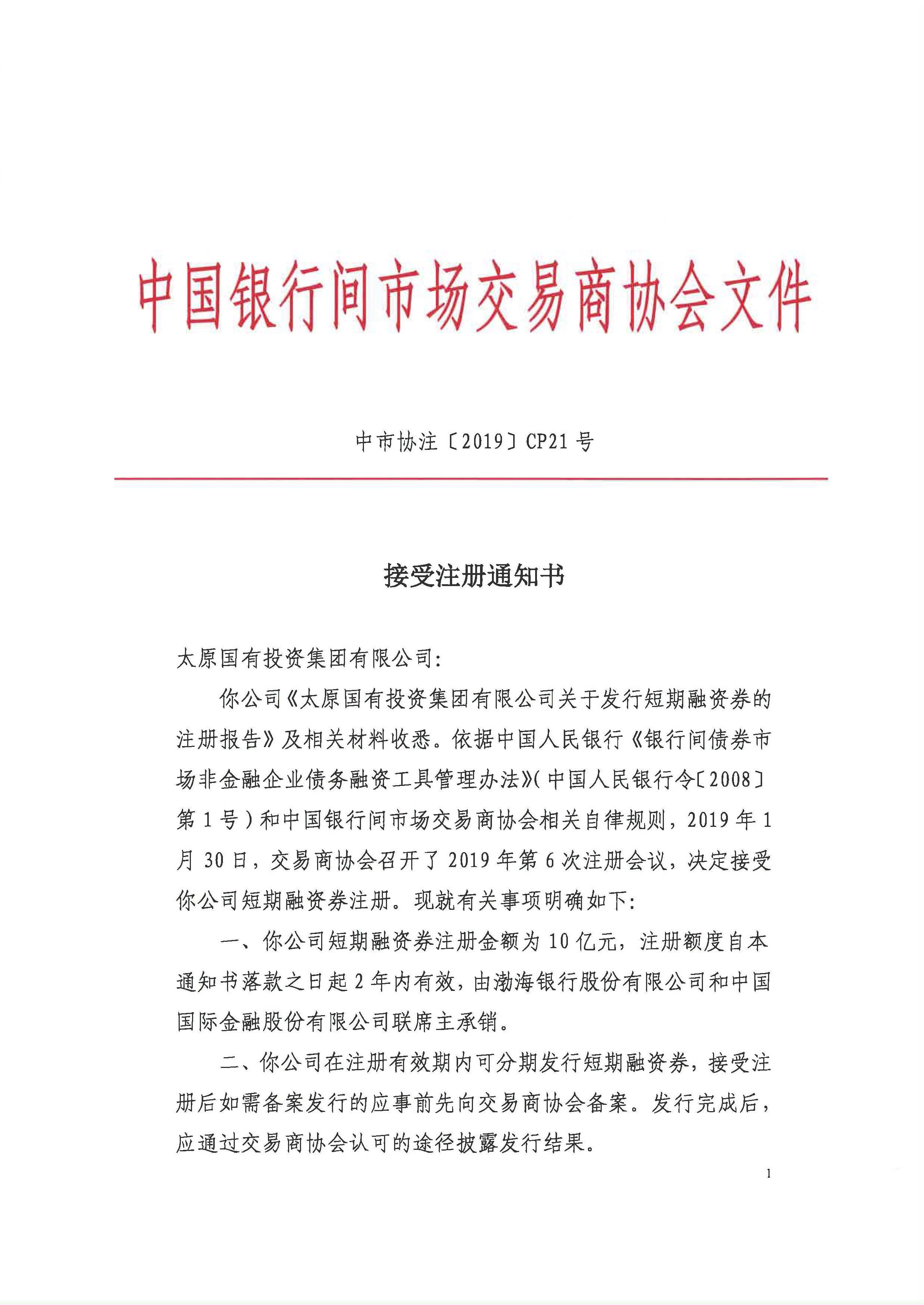 2019年2月14日,新年伊始,集團公司收到中國銀行間市場交易商協(xié)會通知,接受太原國投集團10億元短期融資券注冊,該項目是集團在2019年完成的第一筆直接融資項目,至此集團今年已完成新增融資授信20億元。