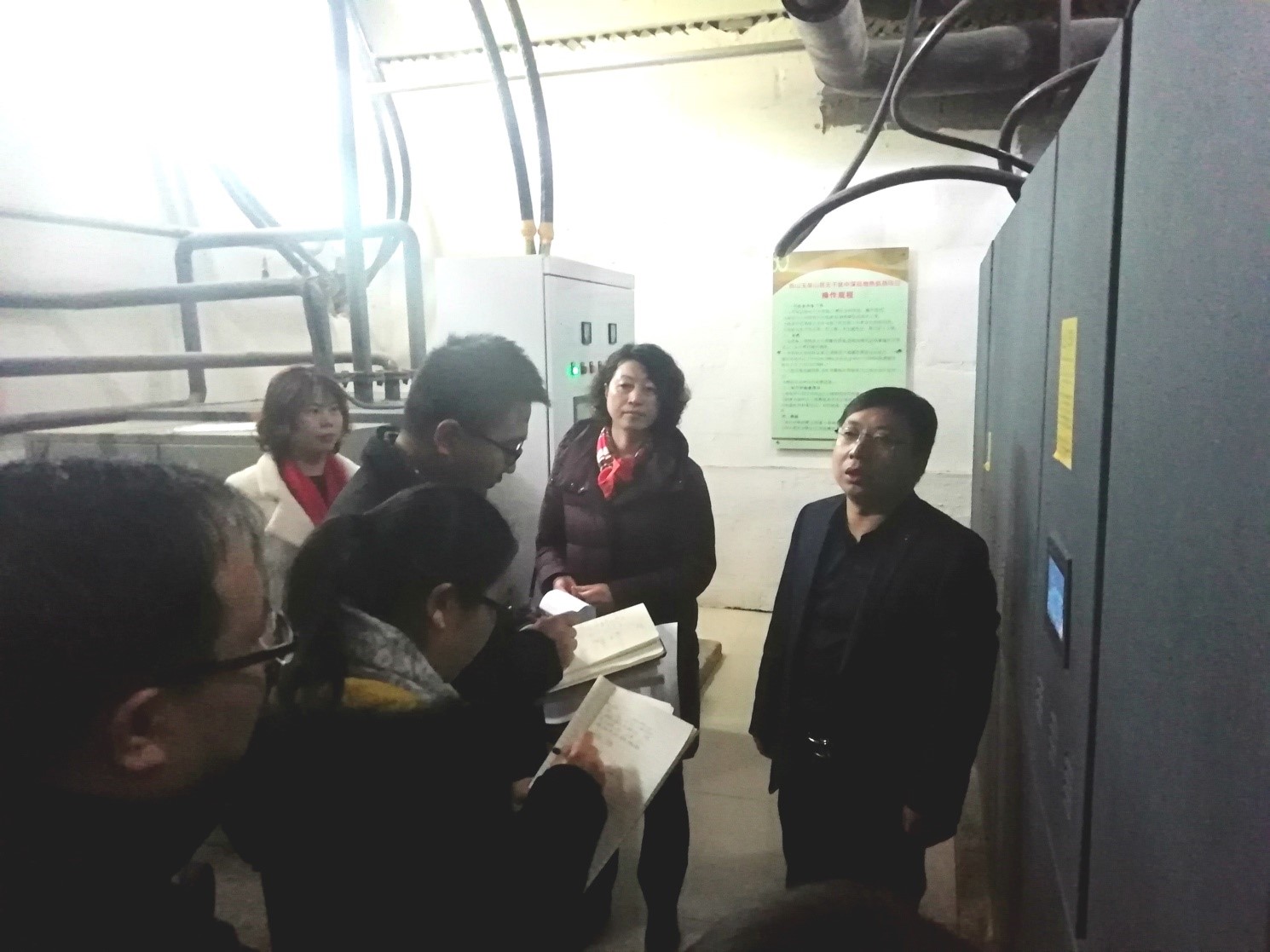隨后,調(diào)研組參觀了能源站設(shè)備間、一號井井室及三號井井場,詳細(xì)詢問了供熱運營、地?zé)峋┕で闆r,并與我公司人員充分交流和討論了中深層無干擾地?zé)岬氖┕すに?、工程難度及項目進(jìn)行中存在的問題等。