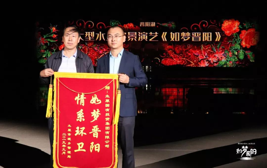 隨后,太原市城鄉(xiāng)管理局副局長時中瑛為太原國投商業(yè)運營管理有限公司總經(jīng)理張耀偉、北京金藝世紀文化傳媒有限公司山西分公司副總經(jīng)理徐婧贈送了“如夢晉陽·情系環(huán)衛(wèi)”的錦旗。