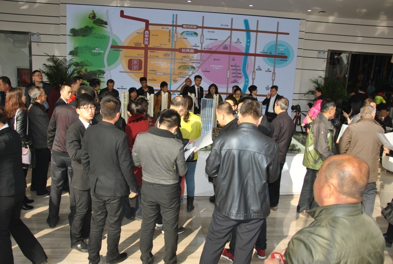 一樓大廳的沙盤前圍滿了客戶,不少人拿著戶型圖仔細研究,顯示出極大的興趣,逍邦的工作人員忙碌而耐心地為客戶做專業(yè)的解答。