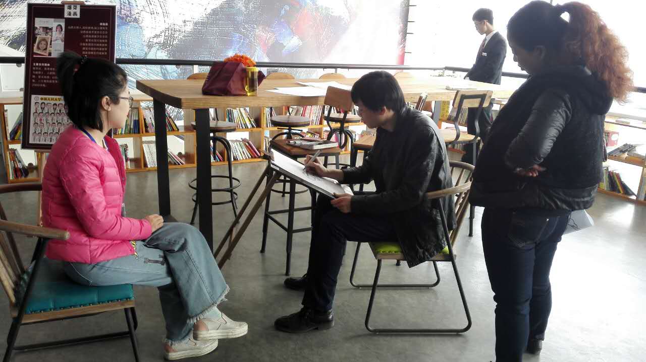 漫畫大師專注地為客戶素描畫像